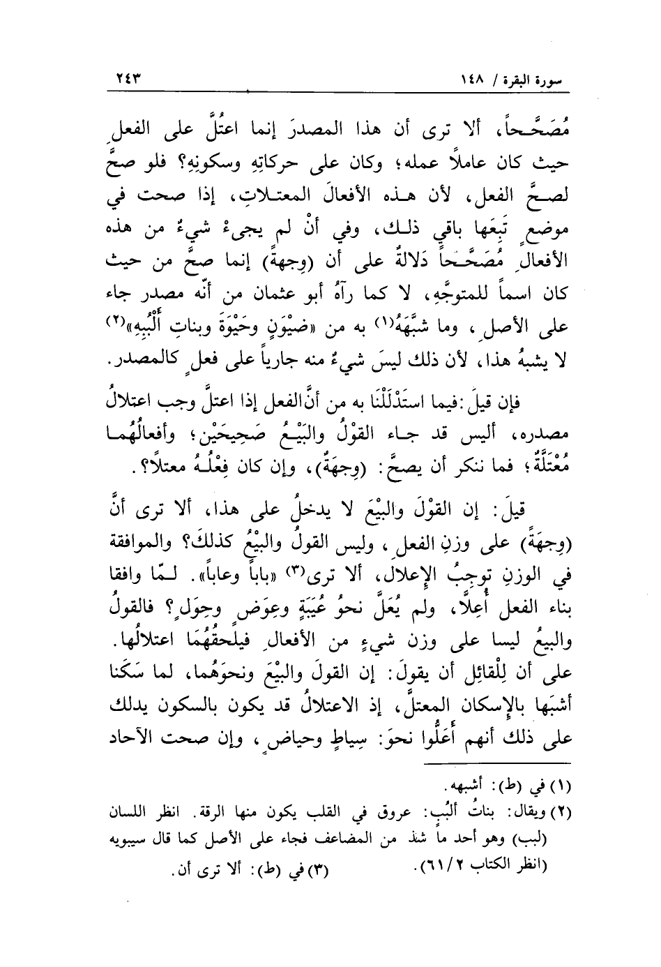 قيل: إن القول والبيع لا يدخل على هذا، ألا ترى أنّ وِجْهَةٌ على وزن الفعل، وليس القول والبيع كذلك؟ والموافقة في الوزن توجب الإعلال، ألا ترى «3» «بابا وعاباً». لمّا وافقا بناء الفعل أعلّا، ولم يعلّ نحو عيبة وعوض وحول؟ فالقول والبيع ليسا على وزن شيء من الأفعال فيلحقهما اعتلالها.