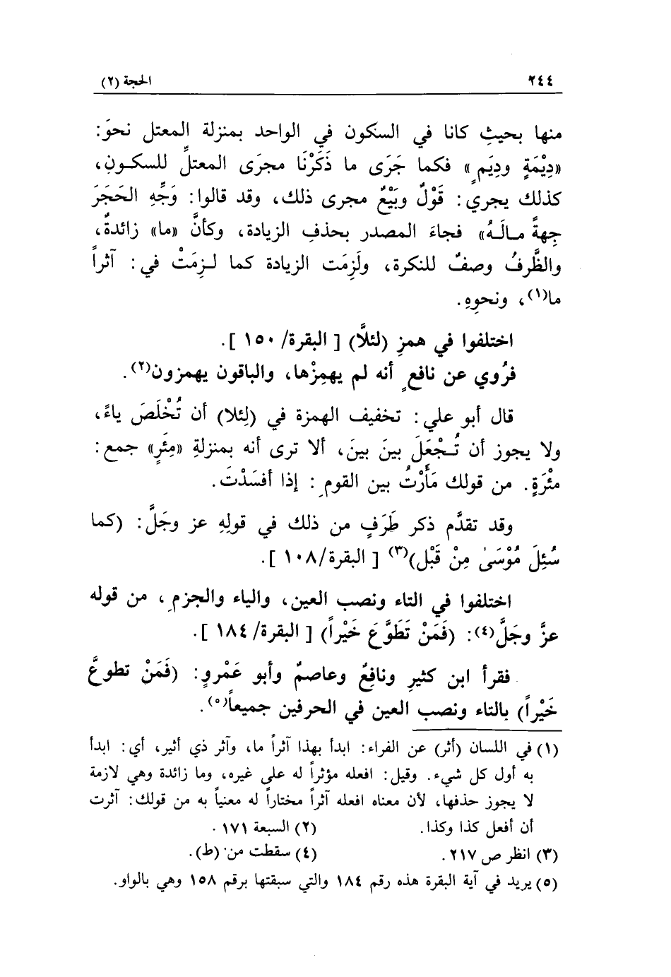 (5) يريد في آية البقرة هذه رقم 184 والتي سبقتها برقم 158 وهي بالواو.
