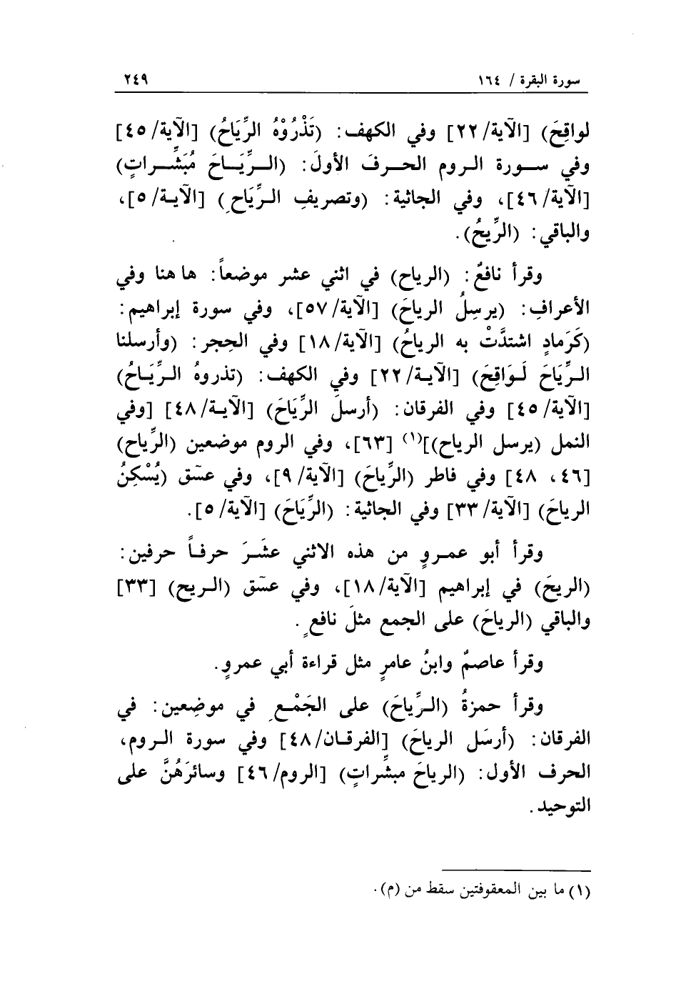 وقرأ نافع: الرِّياحِ في اثني عشر موضعاً: هاهنا وفي الأعراف: يُرْسِلُ الرِّياحَ [الآية/ 57]، وفي سورة إبراهيم: