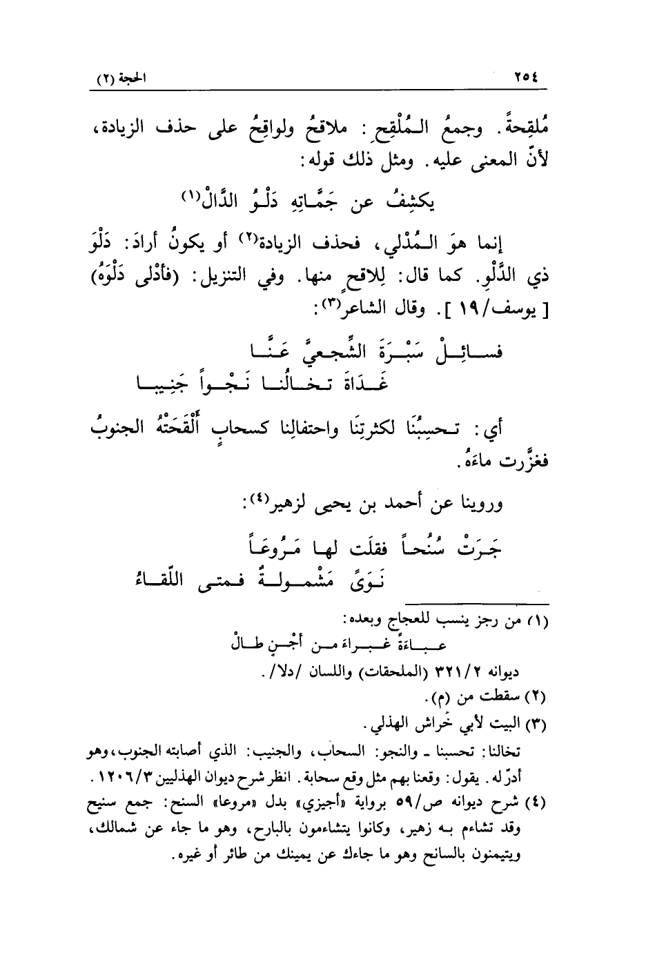 يكشف عن جمّاته دلو الدّال «1» إنما هو المدلي، فحذف الزيادة «2» أو يكون أراد: دلو ذي الدّلو. كما قال: للاقح منها. وفي التنزيل: فَأَدْلى دَلْوَهُ [يوسف/ 19]. وقال الشاعر «3»: