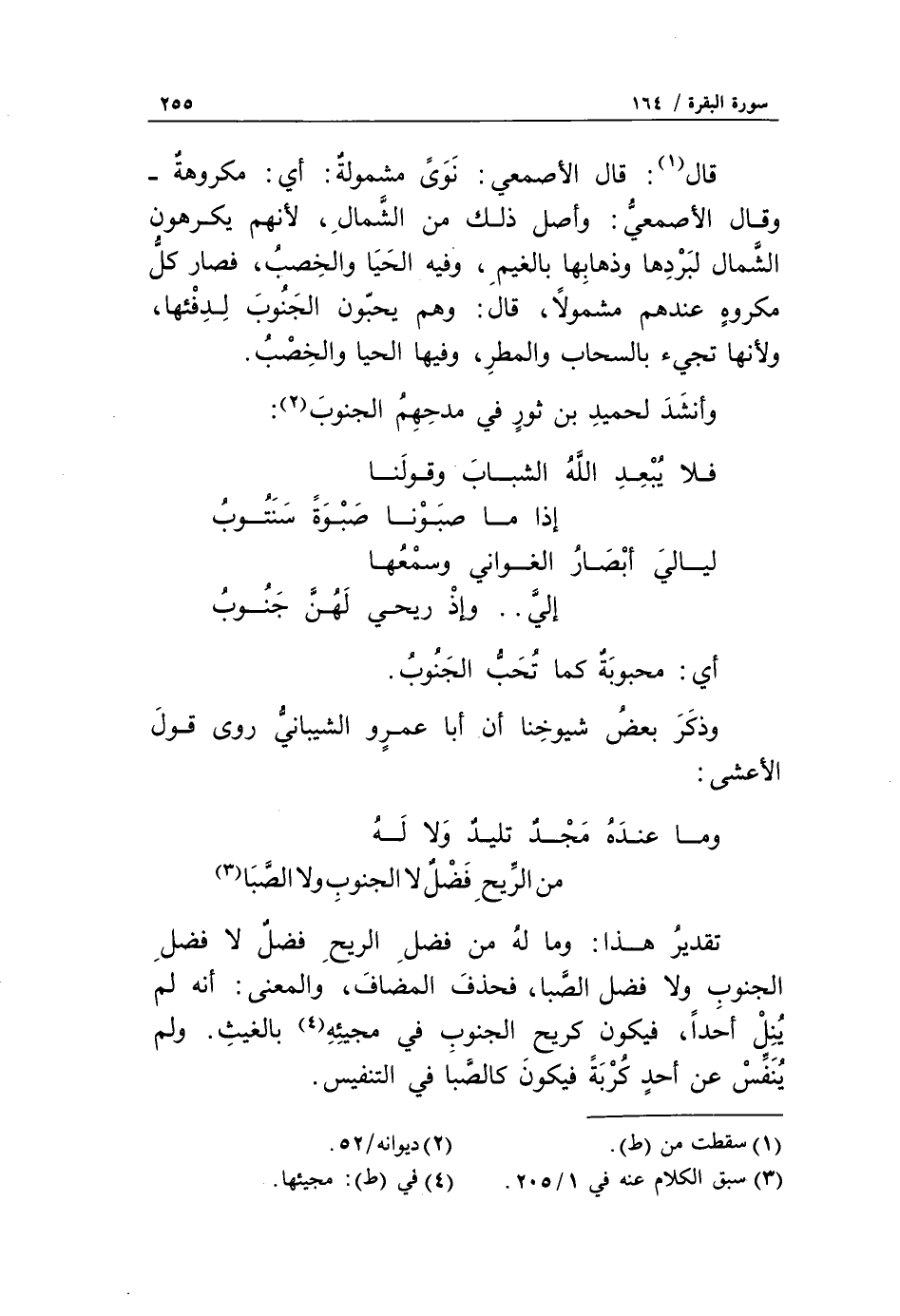 «3» تقدير هذا: وما له من فضل الريح فضل لا فضل الجنوب ولا فضل الصّبا، فحذف المضاف، والمعنى: أنه لم ينل أحداً، فيكون كريح الجنوب في مجيئه «4» بالغيث. ولم ينفّس عن أحد كربة فيكون كالصّبا في التنفيس.