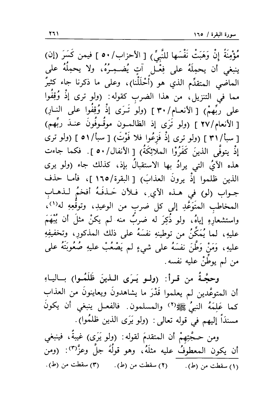 وحجّة من قرأ: وَلَوْ يَرَى الَّذِينَ ظَلَمُوا بالياء أن المتوعّدين لم يعلموا قدر ما يشاهدون ويعاينون من العذاب كما علمه النبي صلّى الله عليه وآله وسلّم «2» والمسلمون. فالفعل ينبغي أن يكون مسنداً إليهم في قوله تعالى: وَلَوْ يَرَى الَّذِينَ ظَلَمُوا.