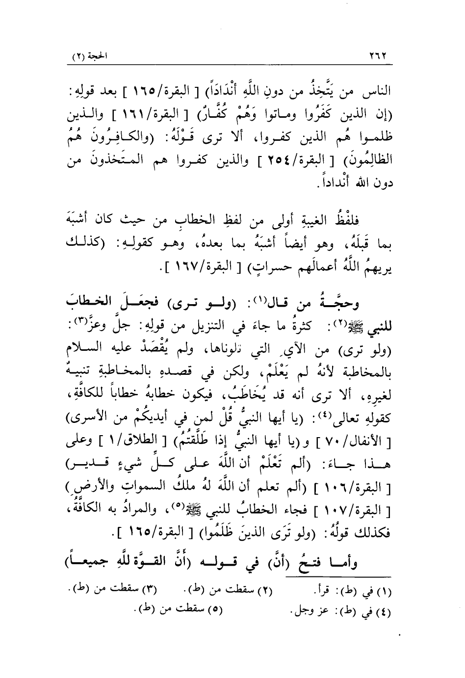 ولو ترى من الآي التي تلوناها، ولم يقصد عليه السلام بالمخاطبة لأنه لم يعلم، ولكن في قصده بالمخاطبة تنبيه لغيره، ألا ترى أنه قد يخاطب، فيكون خطابه خطاباً للكافّة، كقوله تعالى «4»: يا أَيُّهَا النَّبِيُّ قُلْ لِمَنْ فِي أَيْدِيكُمْ مِنَ الْأَسْرى [الأنفال/ 70] ويا أَيُّهَا النَّبِيُّ إِذا طَلَّقْتُمُ [الطلاق/ 1] وعلى هذا جاء: أَلَمْ تَعْلَمْ أَنَّ اللَّهَ عَلى كُلِّ شَيْءٍ قَدِيرٌ [البقرة/ 106] أَلَمْ تَعْلَمْ أَنَّ اللَّهَ لَهُ مُلْكُ السَّماواتِ وَالْأَرْضِ [البقرة/ 107] فجاء الخطاب للنبيّ صلّى الله عليه وآله وسلّم «5»، والمراد به الكافّة، فكذلك قوله: ولو ترى الذين ظلموا [البقرة/ 165].