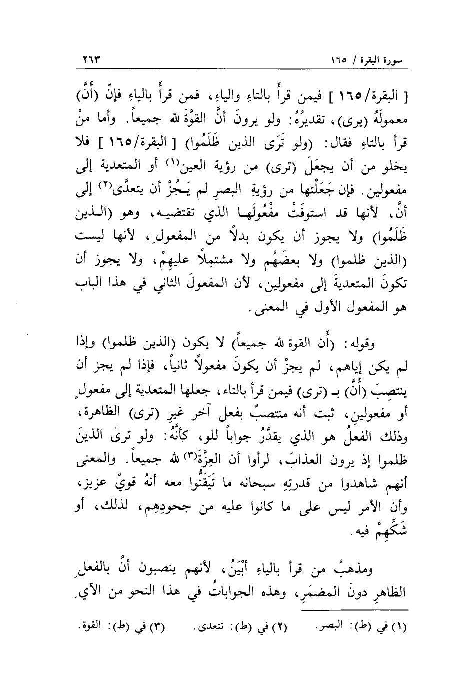 [البقرة/ 165] فيمن قرأ بالتاء والياء، فمن قرأ بالياء فإنّ أَنَّ معموله يَرَى، تقديره: ولو يرون أنّ القوّة لله جميعاً. وأما من قرأ بالتاء فقال: ولو ترى الذين ظلموا [البقرة/ 165] فلا يخلو من أن يجعل ترى من رؤية العين «1» أو المتعدية إلى مفعولين. فإن جعلتها من رؤية البصر لم يجز أن يتعدّى «2» إلى أنّ، لأنها قد استوفت مفعولها الذي تقتضيه، وهو الَّذِينَ ظَلَمُوا ولا يجوز أن يكون بدلًا من المفعول، لأنها ليست الَّذِينَ ظَلَمُوا ولا بعضهم ولا مشتملًا عليهم، ولا يجوز أن تكون المتعدية إلى مفعولين، لأن المفعول الثاني في هذا الباب هو المفعول الأول في المعنى.