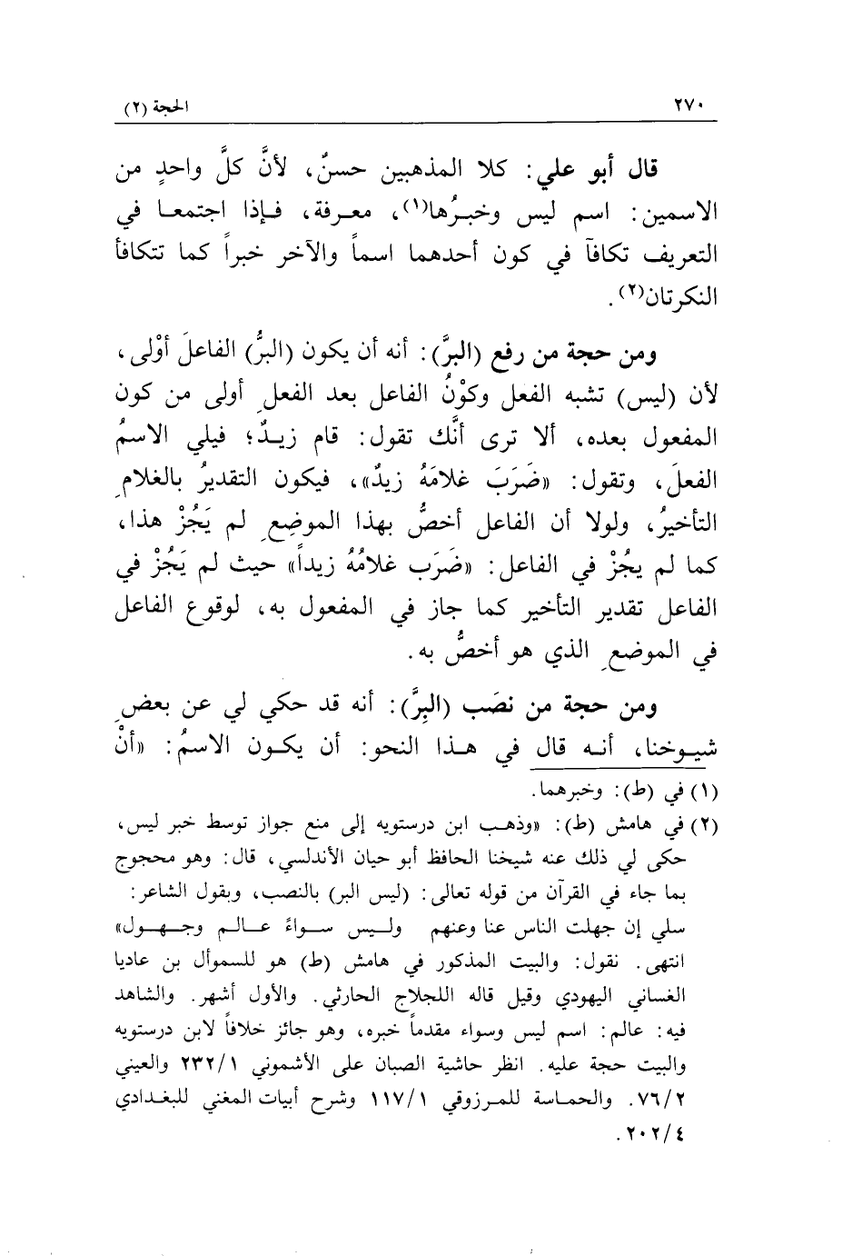 ومن حجة من رفع الْبِرَّ: أنه أن يكون الْبِرَّ الفاعل أولى، لأن لَيْسَ تشبه الفعل وكون الفاعل بعد الفعل أولى من كون المفعول بعده، ألا ترى أنّك تقول: قام زيد؛ فيلي الاسم الفعل، وتقول: «ضرب غلامه زيد»، فيكون التقدير بالغلام التأخير، ولولا أن الفاعل أخصّ بهذا الموضع لم يجز هذا، كما لم يجز في الفاعل: «ضرب غلامه زيداً» حيث لم يجز في الفاعل تقدير التأخير كما جاز في المفعول به، لوقوع الفاعل في الموضع الذي هو أخصّ به.