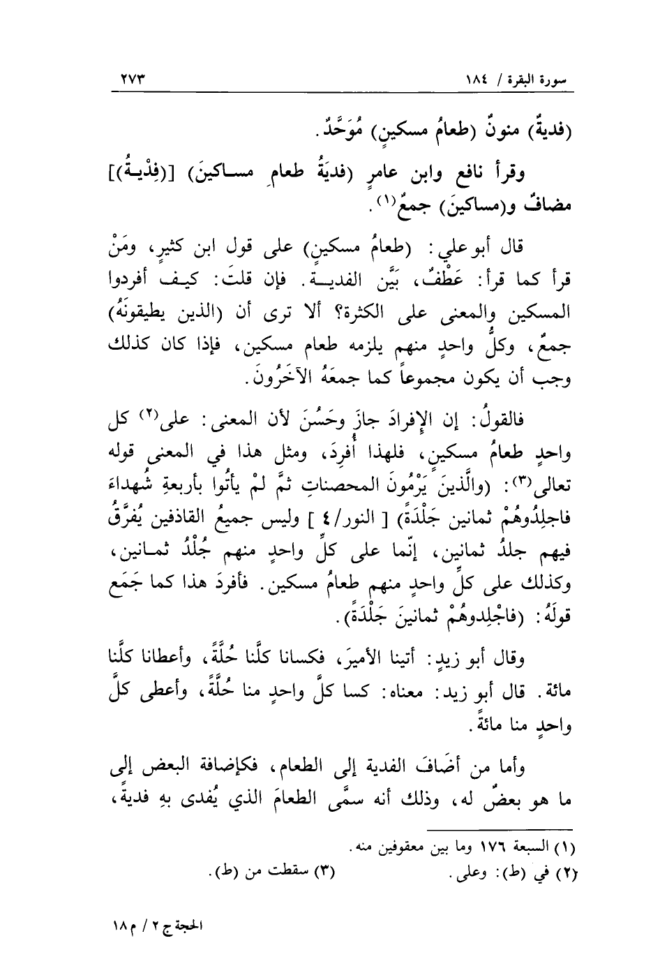 قال أبو علي: طَعامُ مِسْكِينٍ على قول ابن كثير، ومن قرأ كما قرأ: عطف، بيّن الفدية. فإن قلت: كيف أفردوا المسكين والمعنى على الكثرة؟ ألا ترى أن الَّذِينَ يُطِيقُونَهُ جمع، وكلّ واحد منهم يلزمه طعام مسكين، فإذا كان كذلك وجب أن يكون مجموعاً كما جمعه الآخرون.