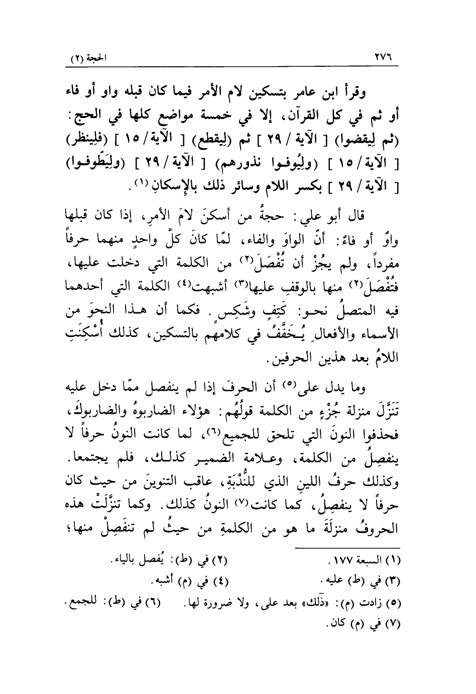 قال أبو علي: حجة من أسكن لام الأمر، إذا كان قبلها واو أو فاء: أنّ الواو والفاء، لمّا كان كلّ واحد منهما حرفاً مفرداً، ولم يجز أن تفصل «2» من الكلمة التي دخلت عليها، فتفصل «2» منها بالوقف عليها «4» أشبهت «5» الكلمة التي أحدهما فيه المتصل نحو: كتف وشكس. فكما أن هذا النحو من الأسماء والأفعال يخفّف في كلامهم بالتسكين، كذلك أسكنت اللام بعد هذين الحرفين.