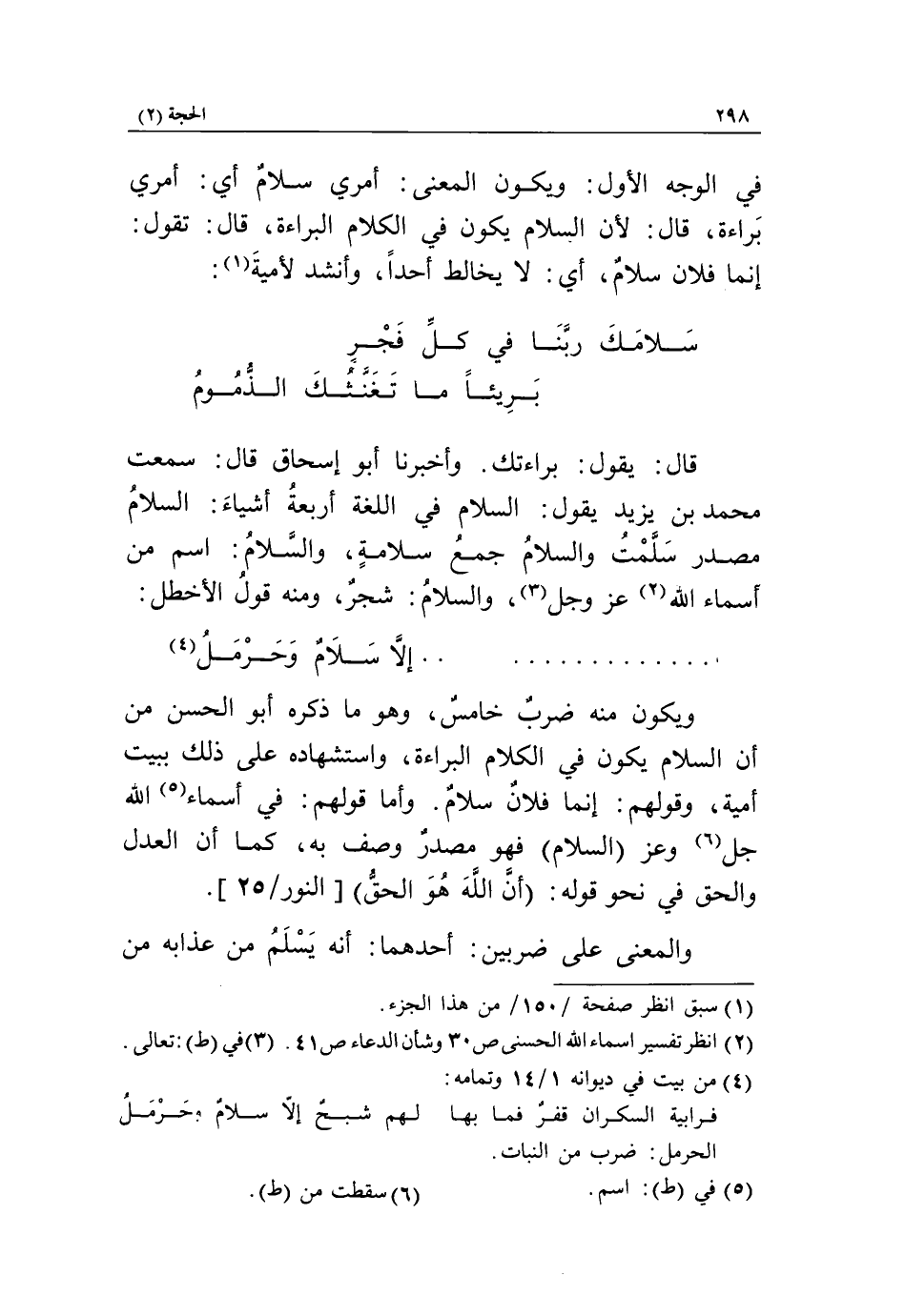 ....... إلّا سلام وحرمل «4» ويكون منه ضرب خامس، وهو ما ذكره أبو الحسن من أن السلام يكون في الكلام البراءة، واستشهاده على ذلك ببيت أمية، وقولهم: إنما فلان سلام. وأما قولهم: في أسماء «5» الله جل «6» وعز (السلام) فهو مصدر وصف به، كما أن العدل والحق في نحو قوله: أَنَّ اللَّهَ هُوَ الْحَقُّ [النور/ 25].