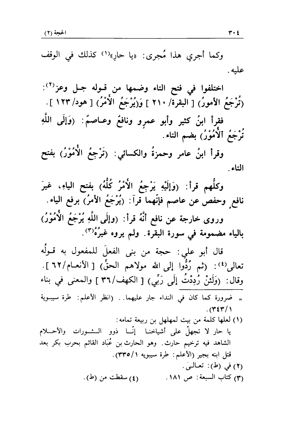 قال أبو علي: حجة من بنى الفعل للمفعول به قوله تعالى «4»: ثُمَّ رُدُّوا إِلَى اللَّهِ مَوْلاهُمُ الْحَقِّ [الأنعام/ 62].