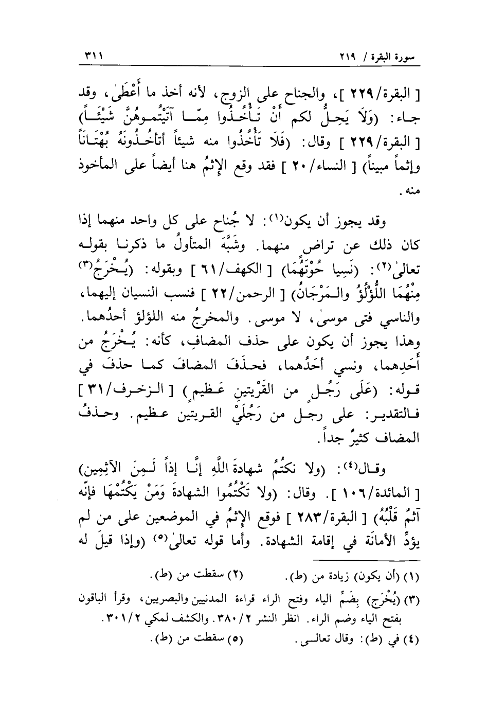 وقد يجوز أن يكون «1»: لا جناح على كل واحد منهما إذا كان ذلك عن تراض منهما. وشبّه المتأول ما ذكرنا بقوله تعالى «2»: نَسِيا حُوتَهُما [الكهف/ 61] وبقوله: يَخْرُجُ «3» مِنْهُمَا اللُّؤْلُؤُ وَالْمَرْجانُ [الرحمن/ 22] فنسب النسيان إليهما، والناسي فتى موسى، لا موسى. والمخرج منه اللؤلؤ أحدهما.