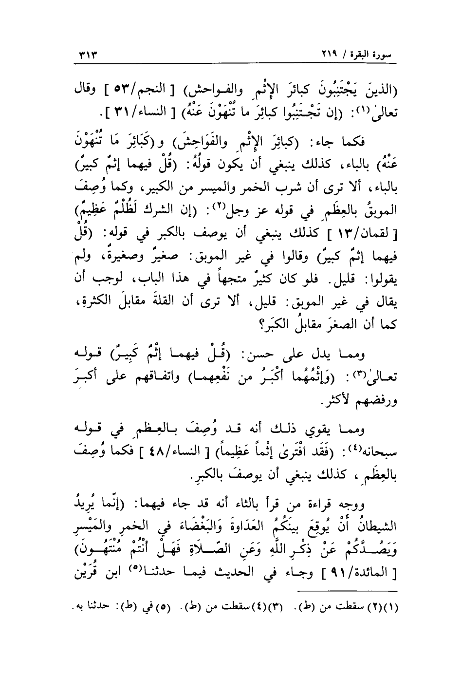 فكما جاء: كَبائِرَ الْإِثْمِ وَالْفَواحِشَ وكَبائِرَ ما تُنْهَوْنَ عَنْهُ بالباء، كذلك ينبغي أن يكون قوله: قُلْ فِيهِما إِثْمٌ كَبِيرٌ بالباء، ألا ترى أن شرب الخمر والميسر من الكبير، وكما وصف الموبق بالعظم في قوله عز وجل «1»: إِنَّ الشِّرْكَ لَظُلْمٌ عَظِيمٌ [لقمان/ 13] كذلك ينبغي أن يوصف بالكبر في قوله: قُلْ فِيهِما إِثْمٌ كَبِيرٌ وقالوا في غير الموبق: صغيرٌ وصغيرةٌ، ولم يقولوا: قليل. فلو كان كثيرٌ متجهاً في هذا الباب، لوجب أن يقال في غير الموبق: قليل، ألا ترى أن القلة مقابل الكثرة، كما أن الصغر مقابل الكبر؟
