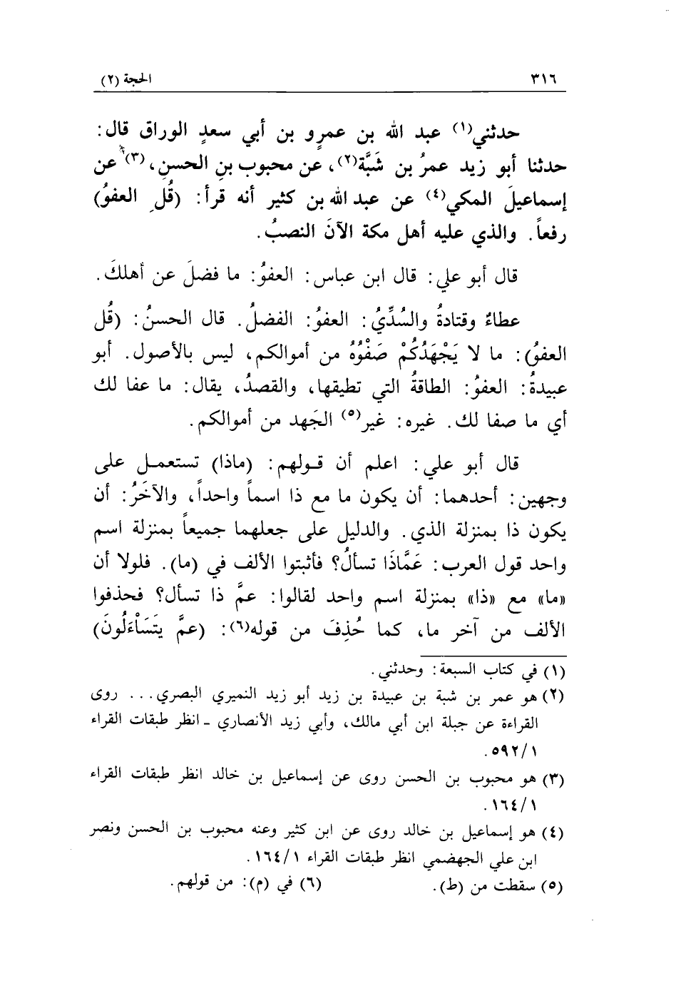 حدثنا أبو زيد عمرُ بن شبّة «2»، عن محبوب بن الحسن، «3» عن إسماعيل المكي «4» عن عبد الله بن كثير أنه قرأ: قُلِ الْعَفْوَ رفعاً. والذي عليه أهل مكة الآن النصبُ.