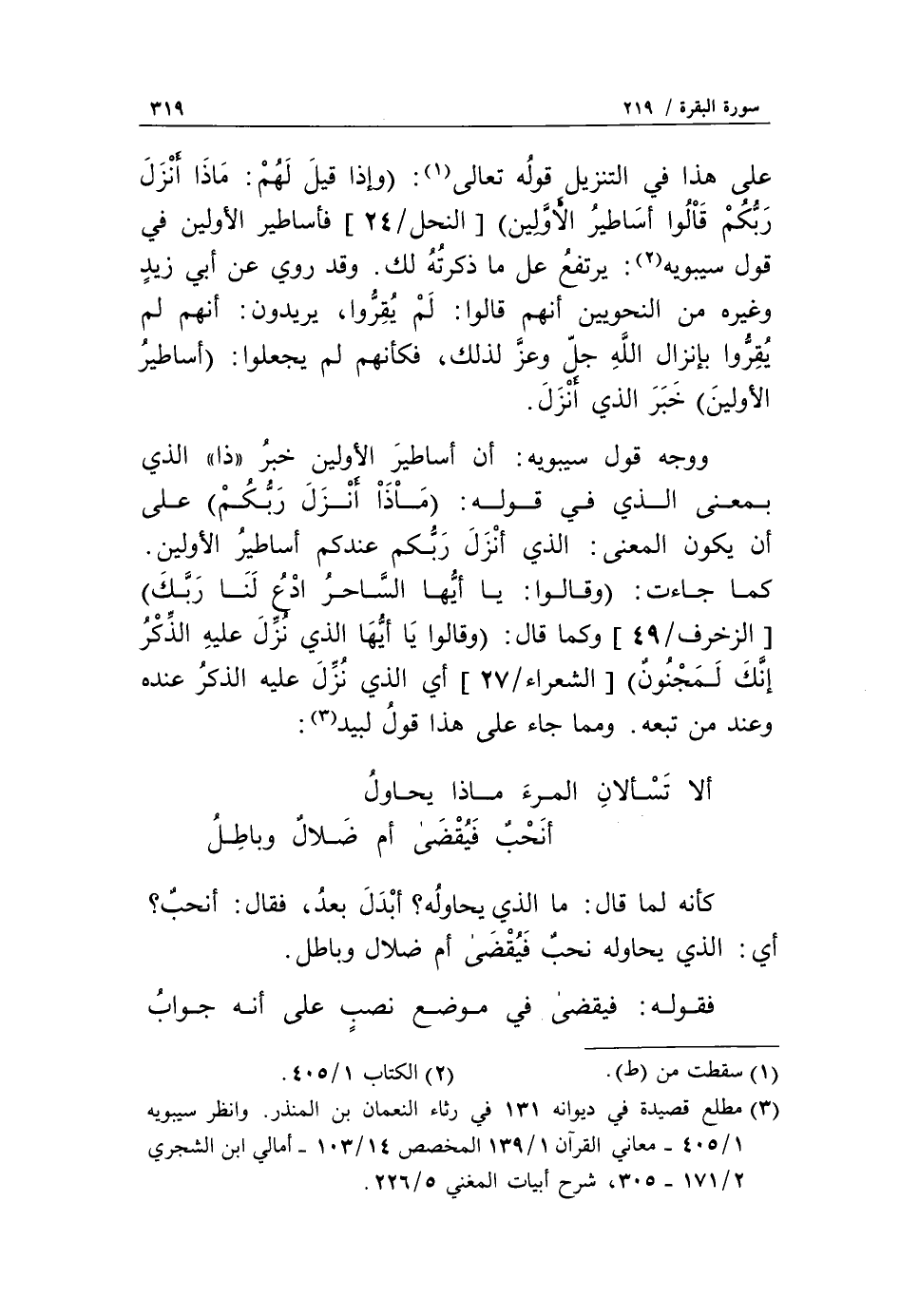 ووجه قول سيبويه: أن أساطير الأولين خبر «ذا» الذي بمعنى الذي في قوله: ماذا أَنْزَلَ رَبُّكُمْ على أن يكون المعنى: الذي أنزل ربّكم عندكم أساطير الأولين.