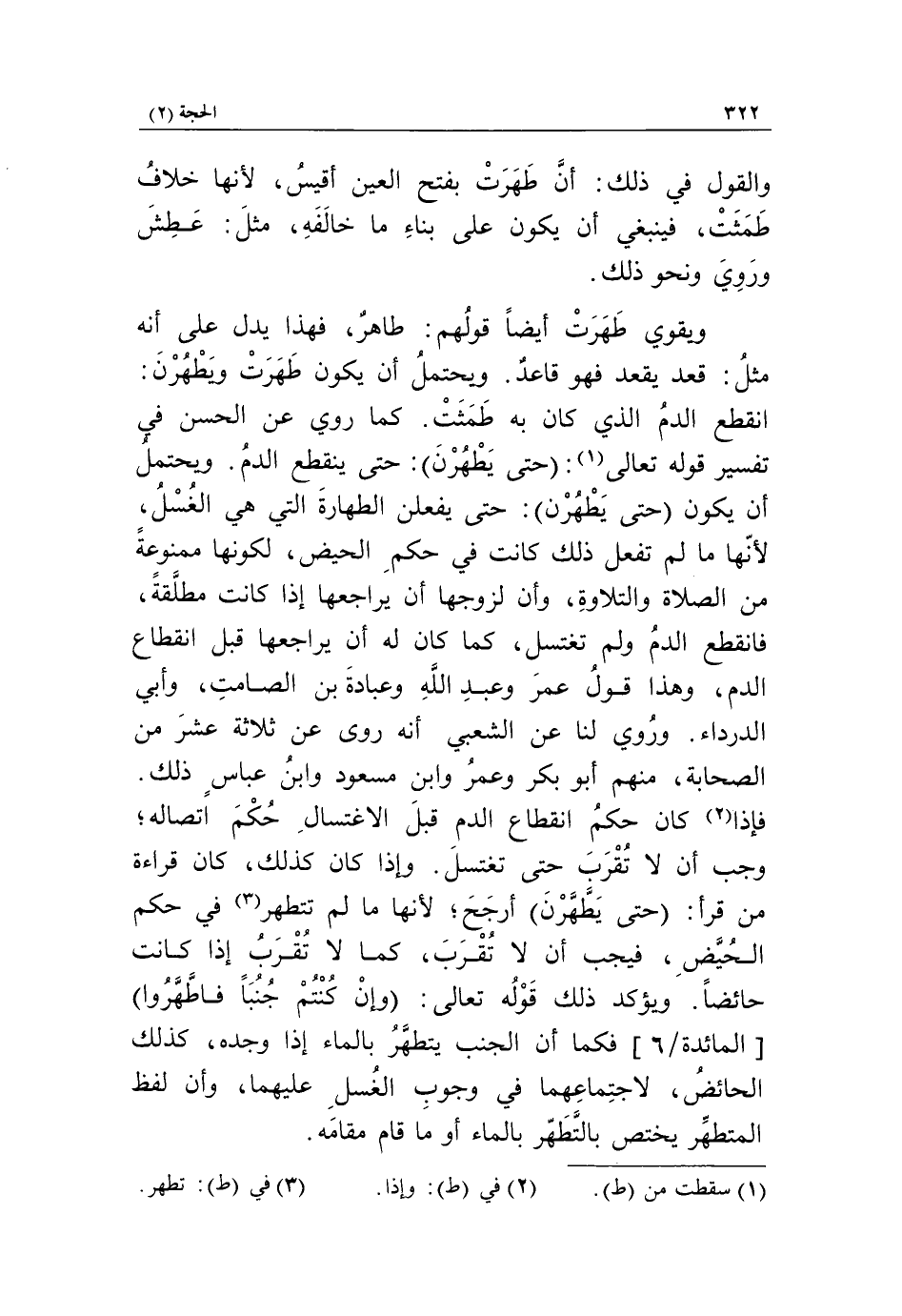 فإذا «2» كان حكم انقطاع الدم قبل الاغتسال حكم اتصاله، وجب أن لا تقرب حتى تغتسل. وإذا كان كذلك، كان قراءة من قرأ: حَتَّى يَطْهُرْنَ أرجح، لأنها ما لم تتطهر «3» في حكم الحُيَّض، فيجب أن لا تقرب، كما لا تقرب إذا كانت حائضاً. ويؤكد ذلك قوله تعالى: وَإِنْ كُنْتُمْ جُنُباً فَاطَّهَّرُوا [المائدة/ 6] فكما أن الجنب يتطهَّر بالماء إذا وجده، كذلك الحائض، لاجتماعهما في وجوب الغسل عليهما، وأن لفظ المتطهّر يختص بالتَّطهّر بالماء أو ما قام مقامه.