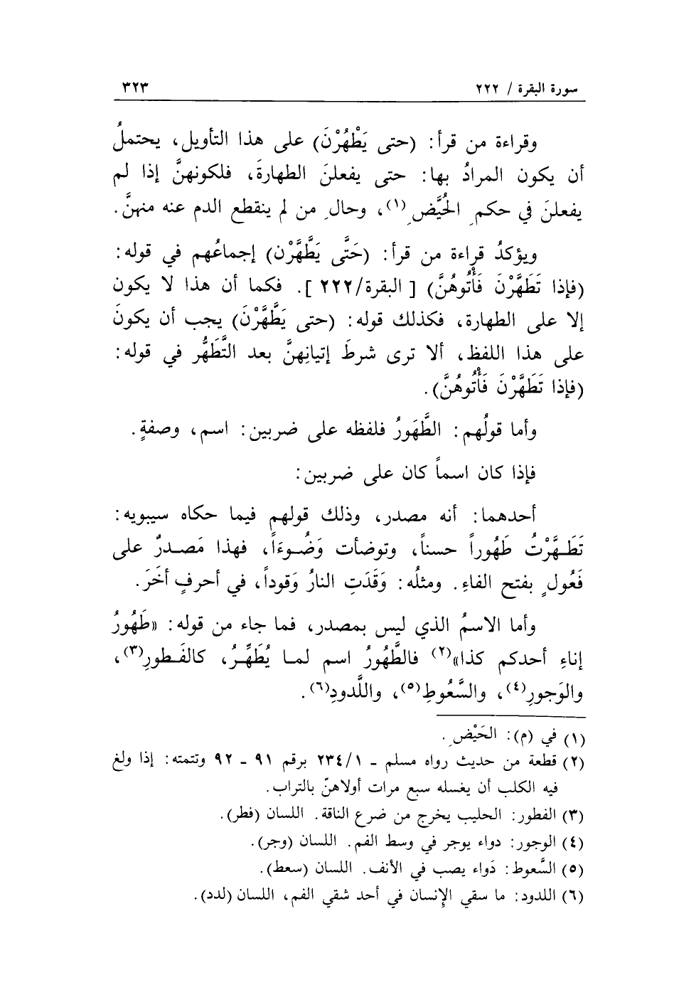 وقراءة من قرأ: حَتَّى يَطْهُرْنَ على هذا التأويل، يحتمل أن يكون المراد بها: حتى يفعلن الطهارة، فلكونهنَّ إذا لم يفعلن في حكم الحيّض «1»، وحال من لم ينقطع الدم عنه منهنّ.