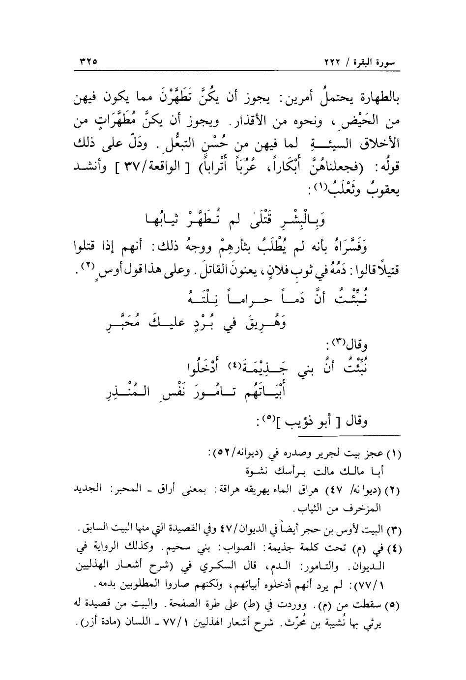 وبالبشر قتلى لم تطهّر ثيابها وفسّراه بأنه لم يطلب بثأرهم ووجه ذلك: أنهم إذا قتلوا قتيلًا قالوا: دمه في ثوب فلانٍ، يعنون القاتل. وعلى هذا قول أوسٍ «2».