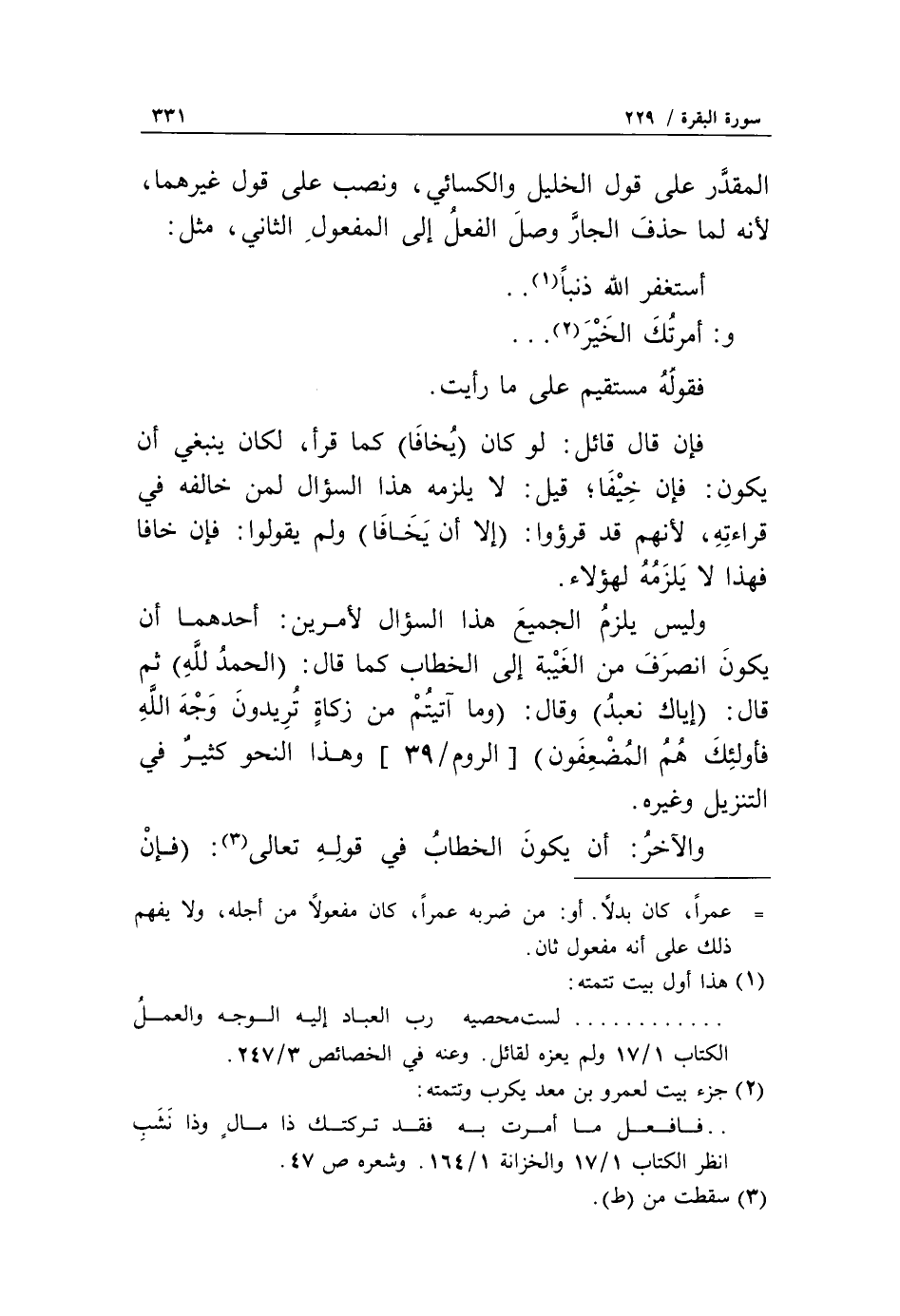 وليس يلزم الجميع هذا السؤال لأمرين: أحدهما أن يكون انصرف من الغيبة إلى الخطاب كما قال: الْحَمْدُ لِلَّهِ ثم قال: إِيَّاكَ نَعْبُدُ وقال: وَما آتَيْتُمْ مِنْ زَكاةٍ تُرِيدُونَ وَجْهَ اللَّهِ فَأُولئِكَ هُمُ الْمُضْعِفُونَ [الروم/ 39] وهذا النحو كثيرٌ في التنزيل وغيره.