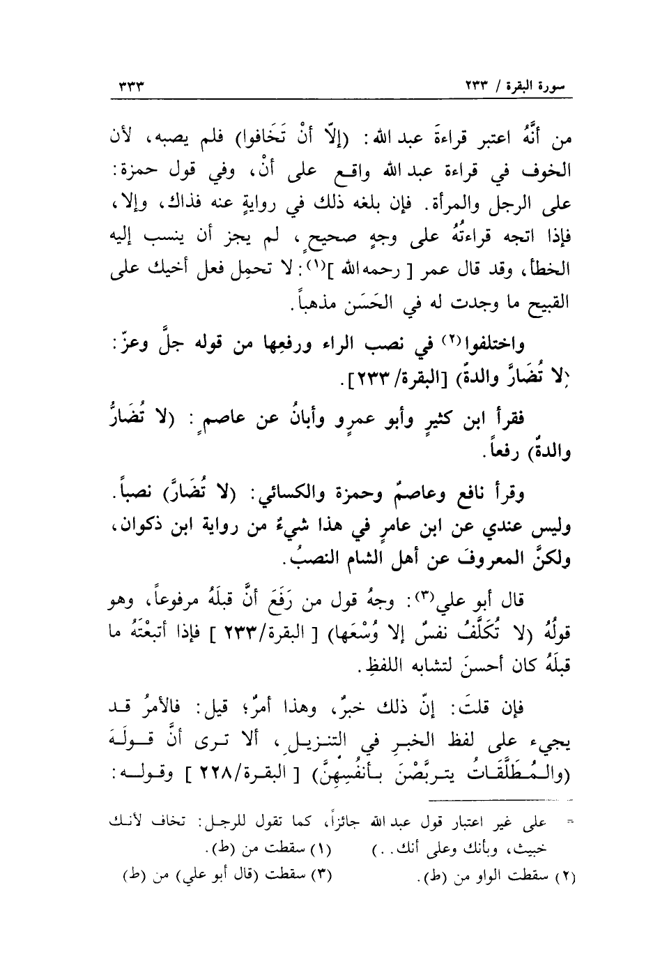 قال أبو علي «3»: وجه قول من رفع أنّ قبله مرفوعا، وهو قوله لا تُكَلَّفُ نَفْسٌ إِلَّا وُسْعَها [البقرة/ 233] فإذا أتبعته ما قبله كان أحسن لتشابه اللفظ.