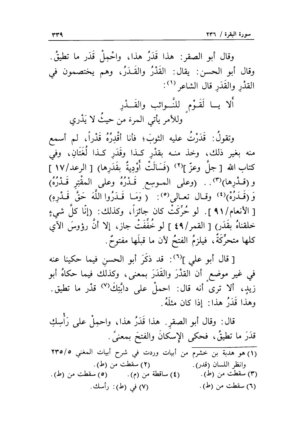 (1) هو هدبة بن خشرم من أبيات وردت في شرح أبيات المغني 5/ 235 وانظر اللسان (قدر).