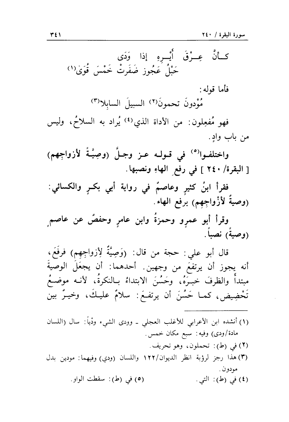 قال أبو علي: حجة من قال: وَصِيَّةً لِأَزْواجِهِمْ فرفع، أنه يجوز أن يرتفع من وجهين. أحدهما: أن يجعل الوصية مبتدأ والظرف خبره، وحسن الابتداء بالنكرة، لأنه موضع تحضيض، كما حسن أن يرتفع: سلام عليك، وخير بين