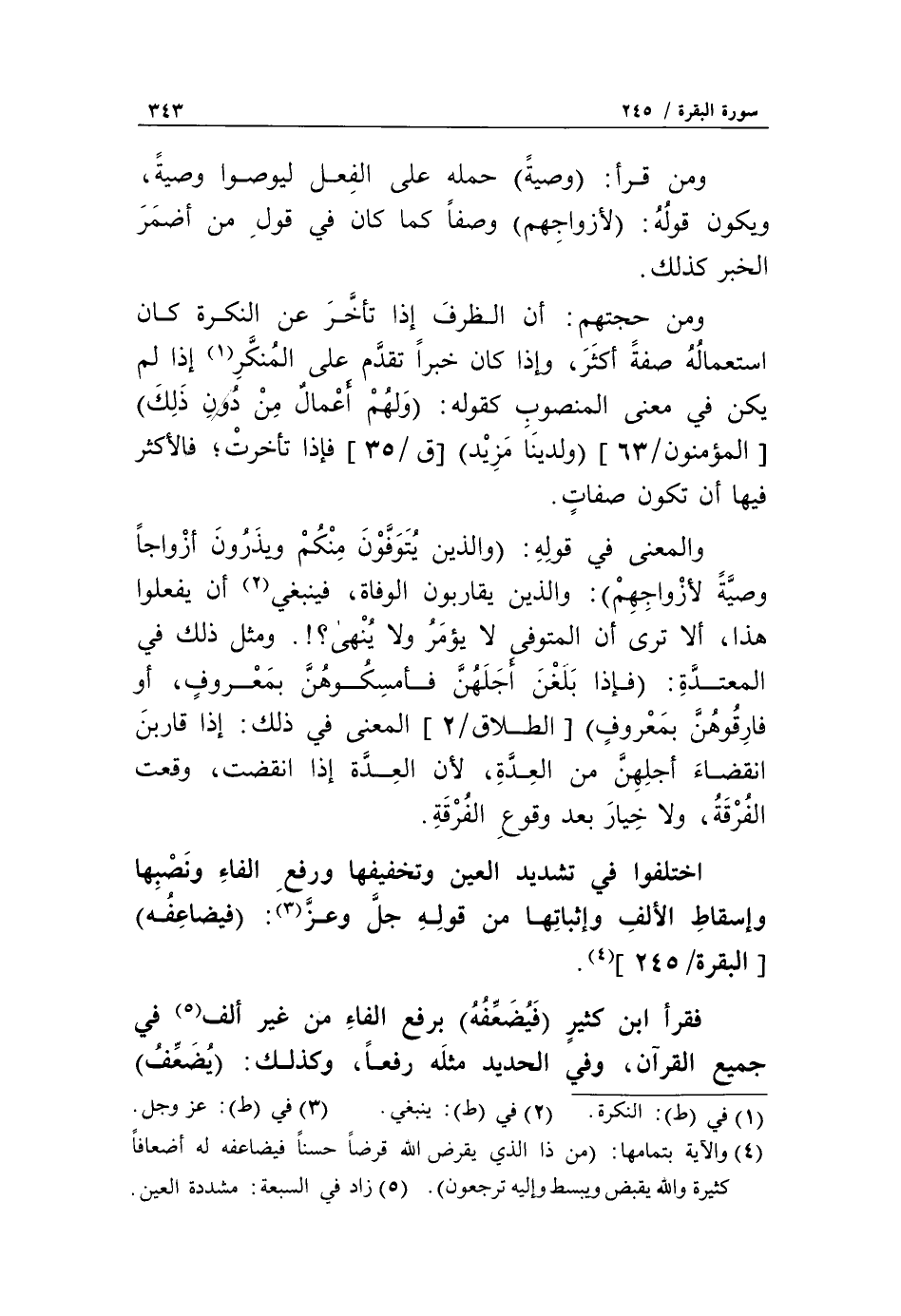 اختلفوا في تشديد العين وتخفيفها ورفع الفاء ونصبها وإسقاط الألف وإثباتها من قوله جلّ وعزّ «3»: فَيُضاعِفَهُ [البقرة/ 245] «4».