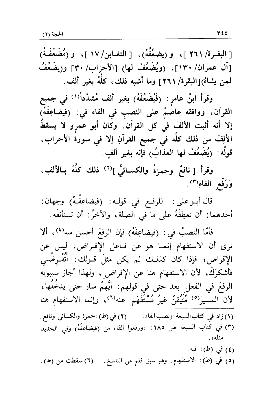 (3) في كتاب السبعة ص 185: «ورفعوا الفاء من فَيُضاعِفَهُ وفي الحديد مثله».