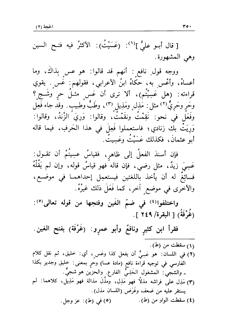 [قال أبو عليّ] «1»: (عسيت): الأكثر فيه فتح السين وهي المشهورة.