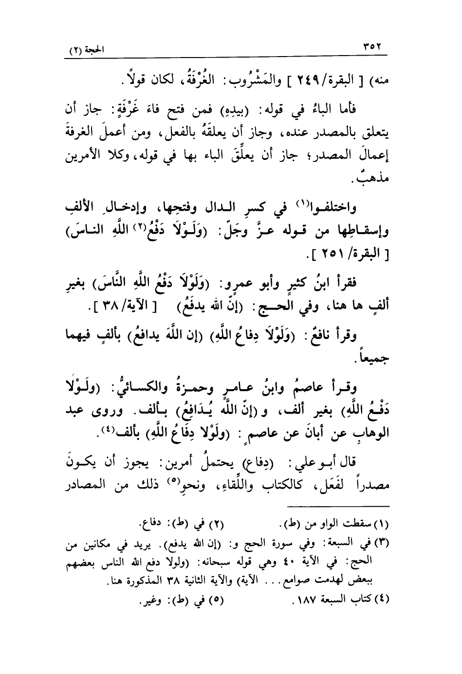 (3) في السبعة: وفي سورة الحج و: إن الله يدفع. يريد في مكانين من الحج: في الآية 40 وهي قوله سبحانه: وَلَوْلا دَفْعُ اللَّهِ النَّاسَ بَعْضَهُمْ بِبَعْضٍ لَهُدِّمَتْ صَوامِعُ ... الآية والآية الثانية 38 المذكورة هنا.