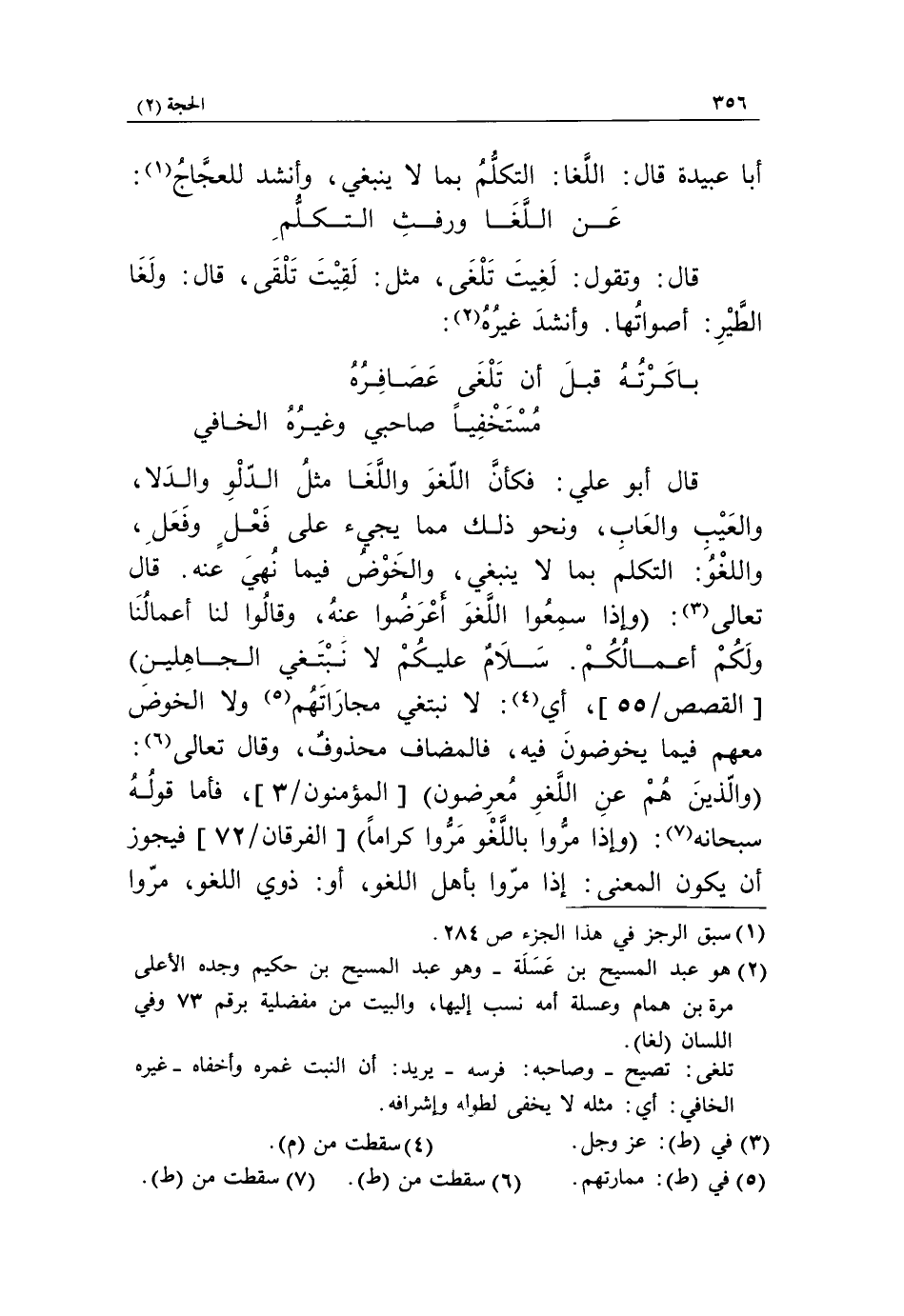 قال أبو علي: فكأنّ اللّغو واللّغا مثل الدّلو والدلا، والعيب والعاب، ونحو ذلك مما يجيء على فعل وفعل، واللغو: التكلم بما لا ينبغي، والخوض فيما نهي عنه. قال تعالى «3»: وَإِذا سَمِعُوا اللَّغْوَ أَعْرَضُوا عَنْهُ، وَقالُوا لَنا أَعْمالُنا وَلَكُمْ أَعْمالُكُمْ. سَلامٌ عَلَيْكُمْ لا نَبْتَغِي الْجاهِلِينَ [القصص/ 55]، أي «4»: لا نبتغي مجاراتهم «5» ولا الخوض معهم فيما يخوضون فيه، فالمضاف محذوف، وقال تعالى «6»:
