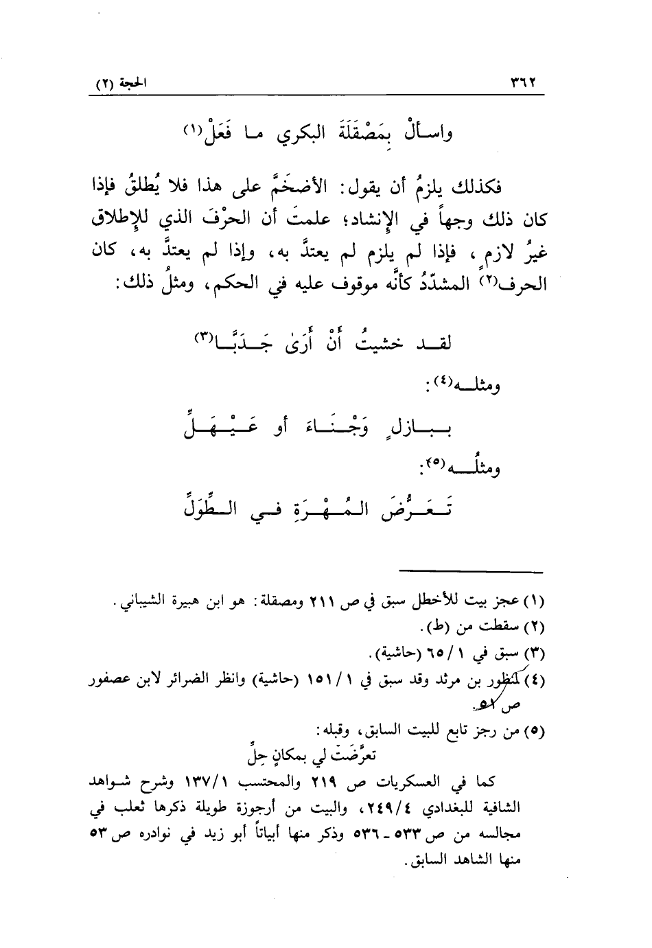 واسأل بمصقلة البكري ما فعل «1» فكذلك يلزم أن يقول: الأضخمّ على هذا فلا يطلق فإذا كان ذلك وجهاً في الإنشاد؛ علمت أن الحرف الذي للإطلاق غير لازم، فإذا لم يلزم لم يعتدّ به، وإذا لم يعتدّ به، كان الحرف «2» المشدّد كأنّه موقوف عليه في الحكم، ومثل ذلك:
