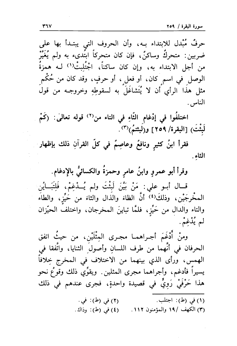 اختلفوا في إدغام الثّاء في التاء من «2» قوله تعالى: كَمْ لَبِثْتَ [البقرة/ 259] ولَبِثْتُمْ «3».