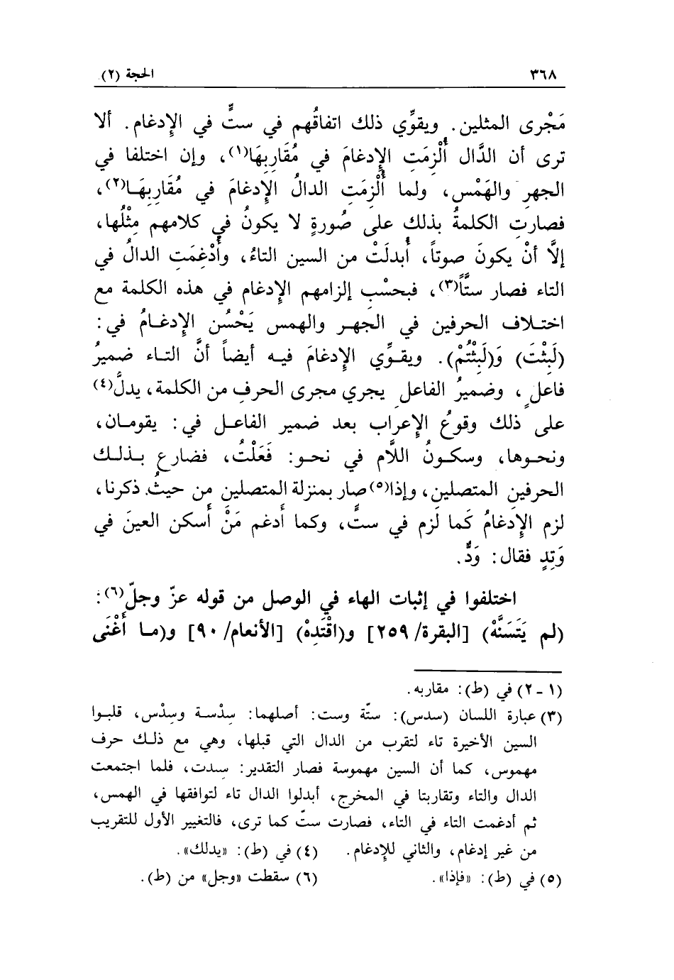 (3) عبارة اللسان (سدس): ستة وست: أصلهما: سدسة وسدس، قلبوا السين الأخيرة تاء لتقرب من الدال التي قبلها، وهي مع ذلك حرف مهموس، كما أن السين مهموسة فصار التقدير: سدت، فلما اجتمعت الدال والتاء وتقاربتا في المخرج، أبدلوا الدال تاء لتوافقها في الهمس، ثم أدغمت التاء في التاء، فصارت ست كما ترى، فالتغيير الأول للتقريب من غير إدغام، والثاني للإدغام.
