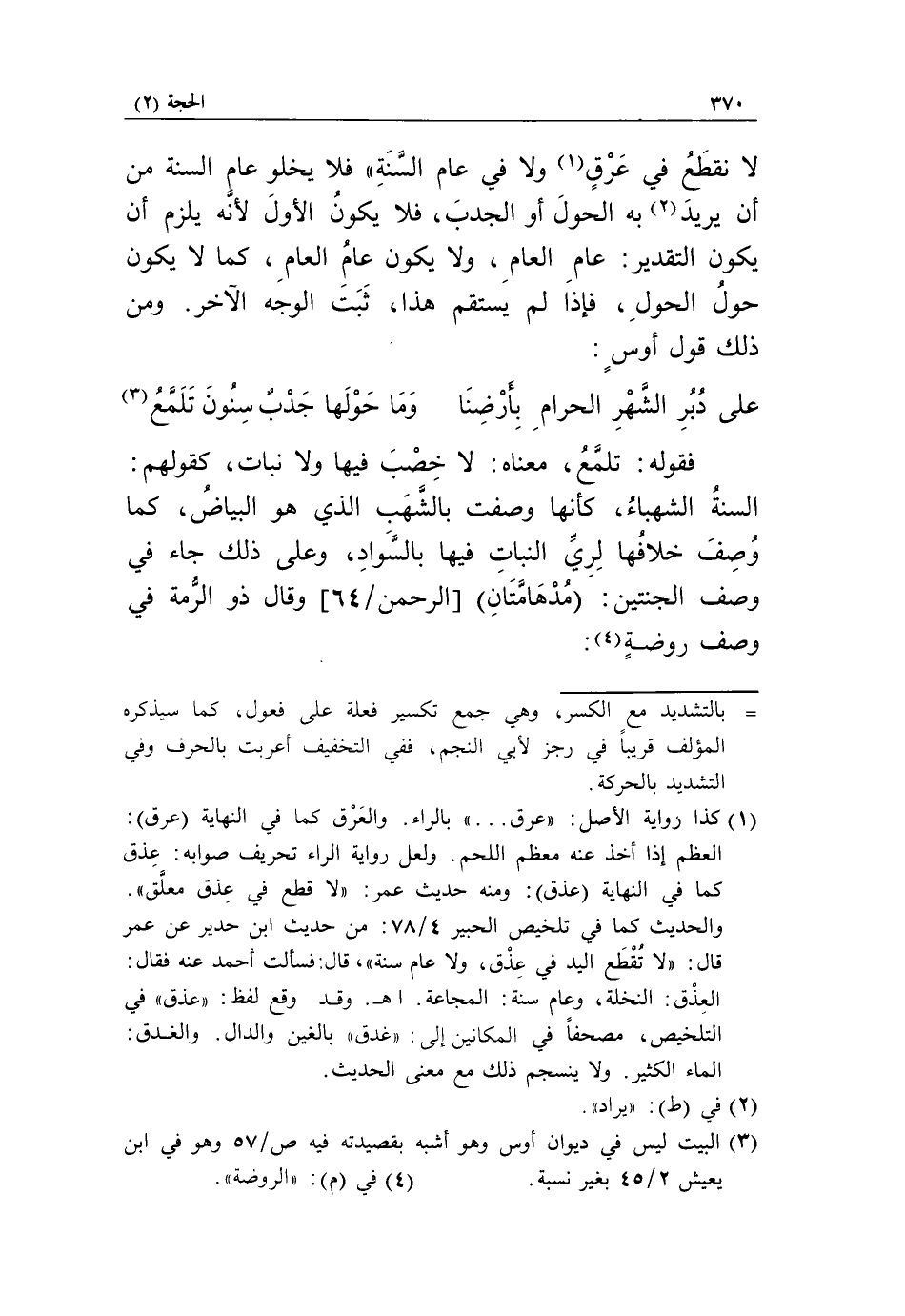 لا نقطع في عرق «1» ولا في عام السّنة» فلا يخلو عام السنة من أن يريد «2» به الحول أو الجدب، فلا يكون الأول لأنّه يلزم أن يكون التقدير: عام العام، ولا يكون عام العام، كما لا يكون حول الحول، فإذا لم يستقم هذا، ثبت الوجه الآخر. ومن ذلك قول أوس: