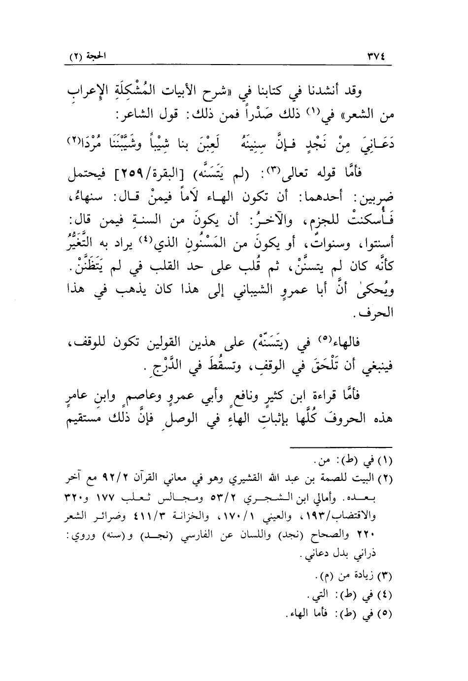 فالهاء «5» في يَتَسَنَّهْ على هذين القولين تكون للوقف، فينبغي أن تلحق في الوقف، وتسقط في الدّرج.