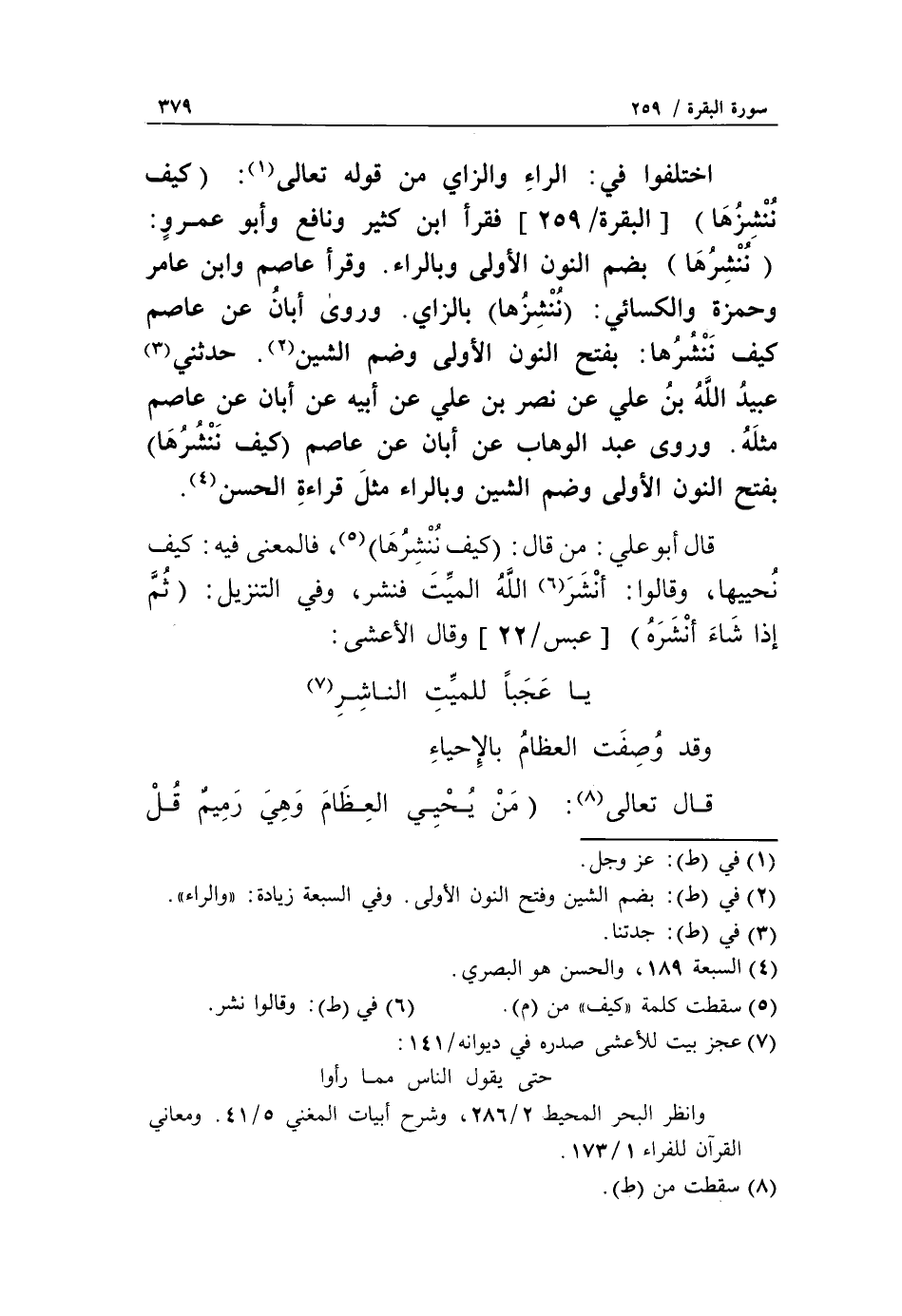 قال أبو علي: من قال: كيف ننشرها «5»، فالمعنى فيه: كيف نحييها، وقالوا: أنشر «6» الله الميّت فنشر، وفي التنزيل: ثُمَّ إِذا شاءَ أَنْشَرَهُ [عبس/ 22] وقال الأعشى: