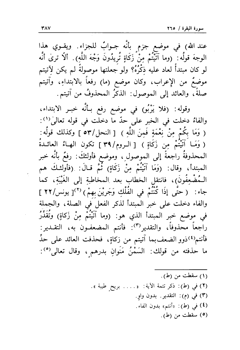 وَما آتَيْتُمْ مِنْ زَكاةٍ [الروم/ 39] تكون الهاء العائدة المحذوفة راجعة إلى الموصول، وموضع فأولئك: رفع بأنّه خبر المبتدأ، وقال: وَما آتَيْتُمْ مِنْ زَكاةٍ ثمّ قال: فَأُولئِكَ هُمُ الْمُضْعِفُونَ، فانتقل الخطاب بعد المخاطبة إلى الغيبة، كما جاء: حَتَّى إِذا كُنْتُمْ فِي الْفُلْكِ وَجَرَيْنَ بِهِمْ «2» [يونس/ 22] والفاء دخلت على خبر المبتدأ لذكر الفعل في الصلة، والجملة في موضع خبر المبتدأ الذي هو: وَما آتَيْتُمْ مِنْ زَكاةٍ وتقدّر راجعاً محذوفاً، والتقدير «3»: فأنتم المضعفون به، التقدير: