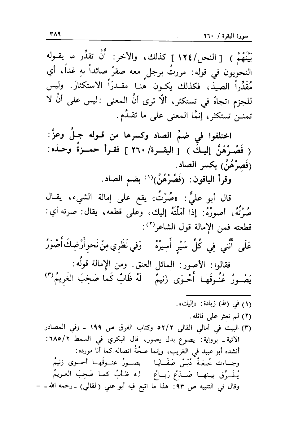 قال أبو عليّ: «صرت» يقع على إمالة الشيء، يقال صرته، أصوره: إذا أملته إليك، وعلى قطعه، يقال: صرته أي: