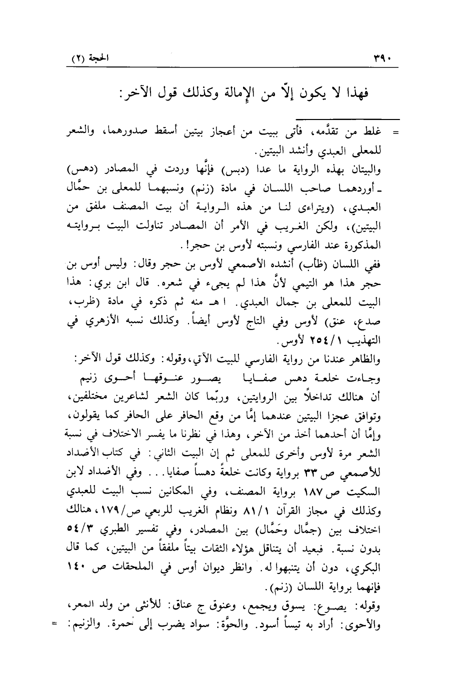 أن هنالك تداخلًا بين الروايتين، وربّما كان الشعر لشاعرين مختلفين، وتوافق عجزا البيتين عندهما إمّا من وقع الحافر على الحافر كما يقولون، وإمّا أن أحدهما أخذ من الآخر، وهذا في نظرنا ما يفسر الاختلاف في نسبة الشعر مرة لأوس وأخرى للمعلى ثم إن البيت الثاني: في كتاب الأضداد للأصمعي ص 33 برواية وكانت خلعة دهساً صفايا ... وفي الأضداد لابن السكيت ص 187 برواية المصنف، وفي المكانين نسب البيت للعبدي وكذلك في مجاز القرآن 1/ 81 ونظام الغريب للربعي ص/ 179، هنالك اختلاف بين (جمّال وحمّال) بين المصادر، وفي تفسير الطبري 3/ 54 بدون نسبة. فبعيد أن يتناقل هؤلاء الثقات بيتاً ملفقاً من البيتين، كما قال البكري، دون أن يتنبهوا له. وانظر ديوان أوس في الملحقات ص 140 فإنهما برواية اللسان (زنم).