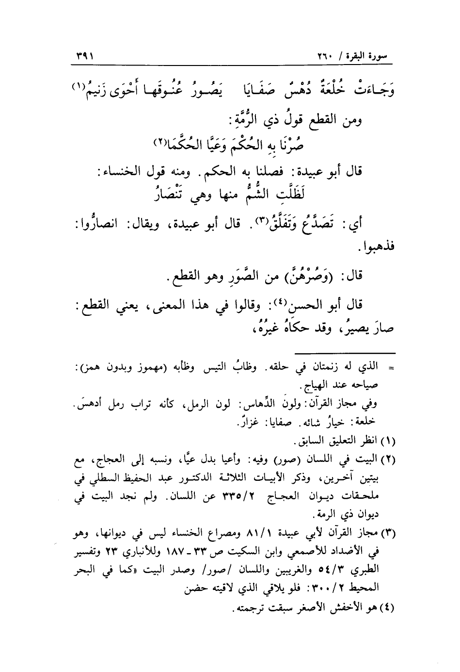 (3) مجاز القرآن لأبي عبيدة 1/ 81 ومصراع الخنساء ليس في ديوانها، وهو في الأضداد للأصمعي وابن السكيت ص 33 - 187 وللأنباري 23 وتفسير الطبري 3/ 54 والغريبين واللسان/ صور/ وصدر البيت «كما في البحر المحيط 2/ 300: فلو يلاقي الذي لاقيته حضن