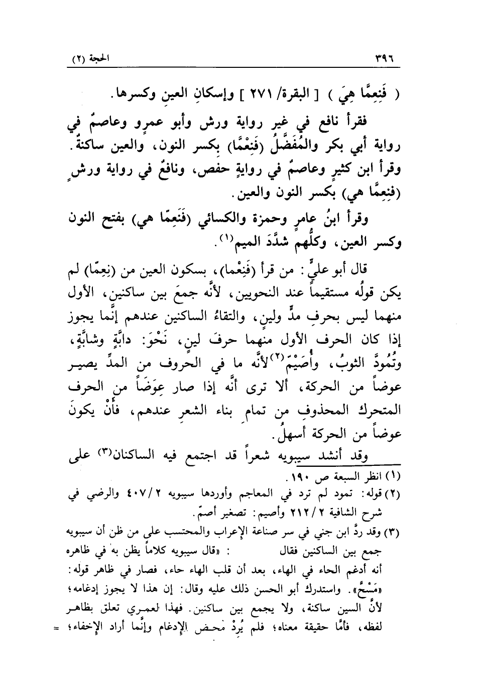 قال أبو عليّ: من قرأ فَنِعِمَّا، بسكون العين من فَنِعِمَّا لم يكن قوله مستقيما عند النحويين، لأنّه جمع بين ساكنين، الأول منهما ليس بحرف مدّ ولين، والتقاء الساكنين عندهم إنّما يجوز إذا كان الحرف الأول منهما حرف لين، نحو: دابّة وشابّة، وتمودّ الثوب، وأصيم «2» لأنّه ما في الحروف من المدّ يصير عوضاً من الحركة، ألا ترى أنّه إذا صار عوضاً من الحرف المتحرك المحذوف من تمام بناء الشعر عندهم، فأن يكون عوضاً من الحركة أسهل.