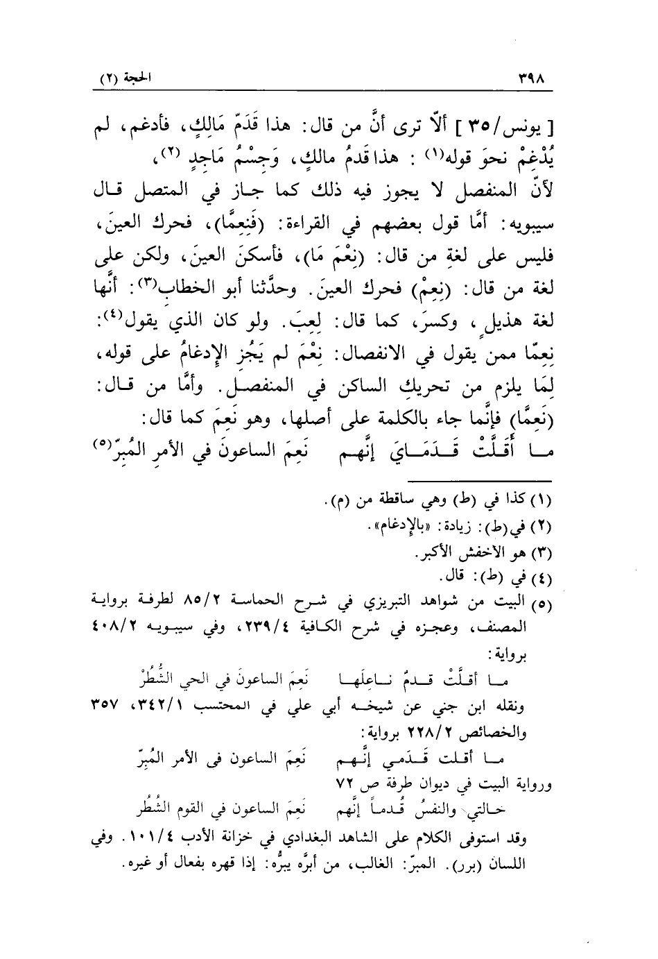[يونس/ 35] ألّا ترى أنّ من قال: هذا قدّم مالك، فأدغم، لم يدغم نحو قوله «1»: هذا قدم مالك، وجسم ماجد «2»، لأنّ المنفصل لا يجوز فيه ذلك كما جاز في المتصل قال سيبويه: أمّا قول بعضهم في القراءة: فَنِعِمَّا، فحرك العين، فليس على لغة من قال: نعم ما، فأسكن العين، ولكن على لغة من قال: نعم فحرك العين. وحدّثنا أبو الخطاب «3»: أنّها لغة هذيل، وكسر، كما قال: لعب. ولو كان الذي يقول «4»: