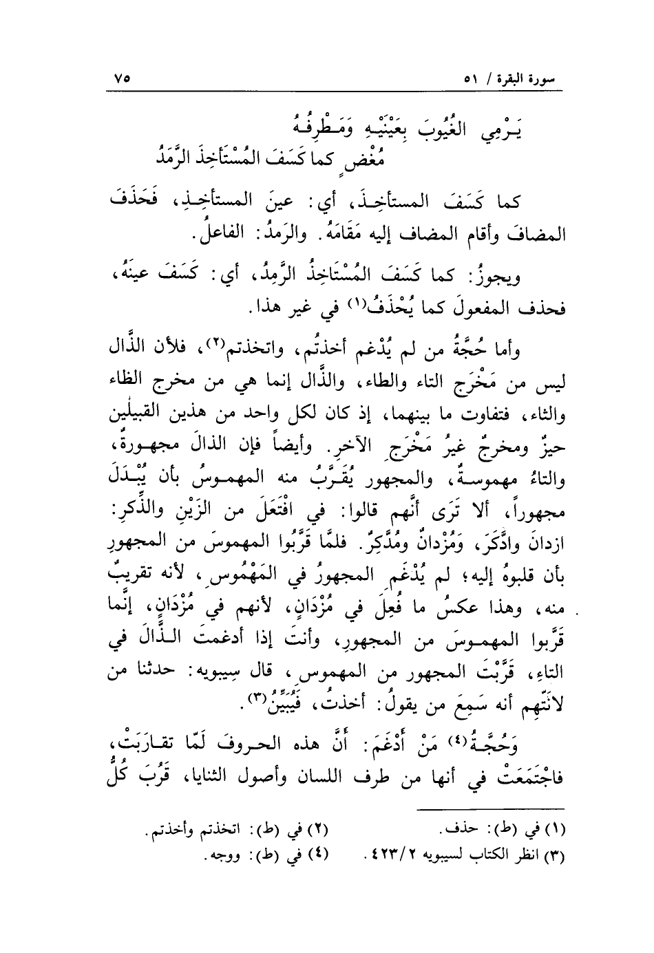 ازدان وادّكر، ومزدان ومدّكر. فلمّا قرّبوا المهموس من المجهور بأن قلبوه إليه، لم يدغم المجهور في المهموس، لأنه تقريب منه، وهذا عكس ما فعل في مزدان، لأنهم في مزدان، إنّما قرّبوا المهموس من المجهور، وأنت إذا أدغمت الذّال في التاء، قرّبت المجهور من المهموس، قال سيبويه: حدثنا من لا نتّهم أنه سمع من يقول: أخذت، فيبيّن «3».