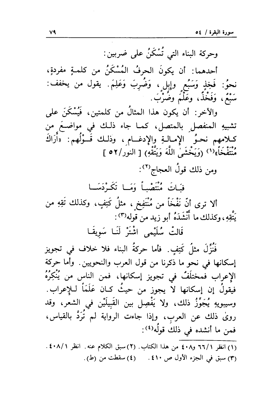 قالت سليمى اشتر لنا سويقا فنزّل مثل كتف. فأما حركة البناء فلا خلاف في تجويز إسكانها في نحو ما ذكرنا من قول العرب والنحويين. وأما حركة الإعراب فمختلف في تجويز إسكانها، فمن الناس من ينكره فيقول إن إسكانها لا يجوز من حيث كان علما للإعراب.