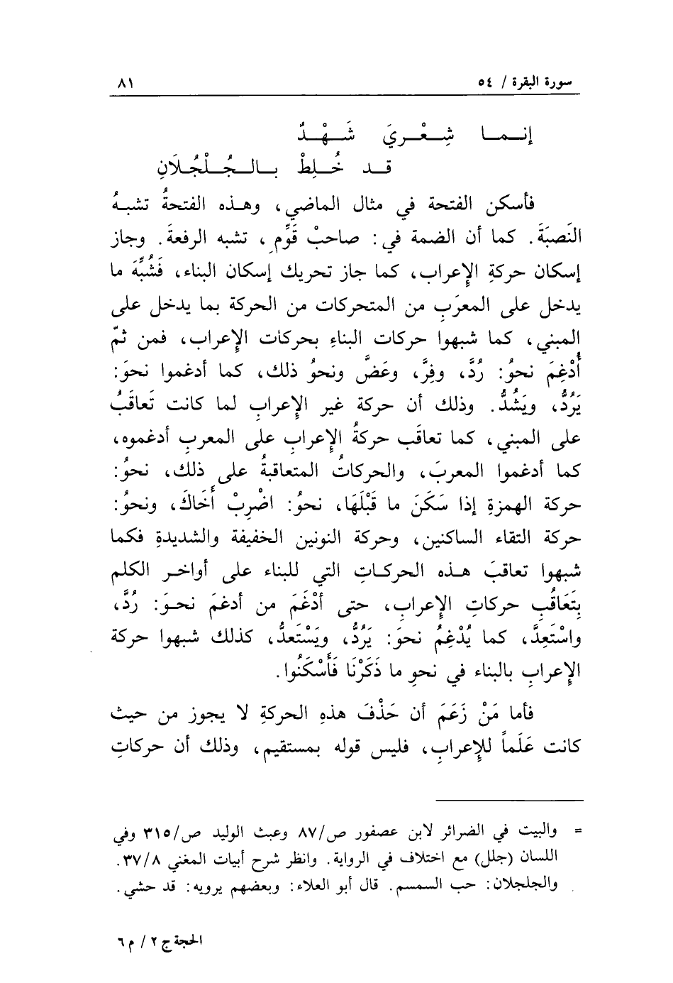 يردّ، ويشدّ. وذلك أن حركة غير الإعراب لما كانت تعاقب على المبني، كما تعاقب حركة الإعراب على المعرب أدغموه، كما أدغموا المعرب، والحركات المتعاقبة على