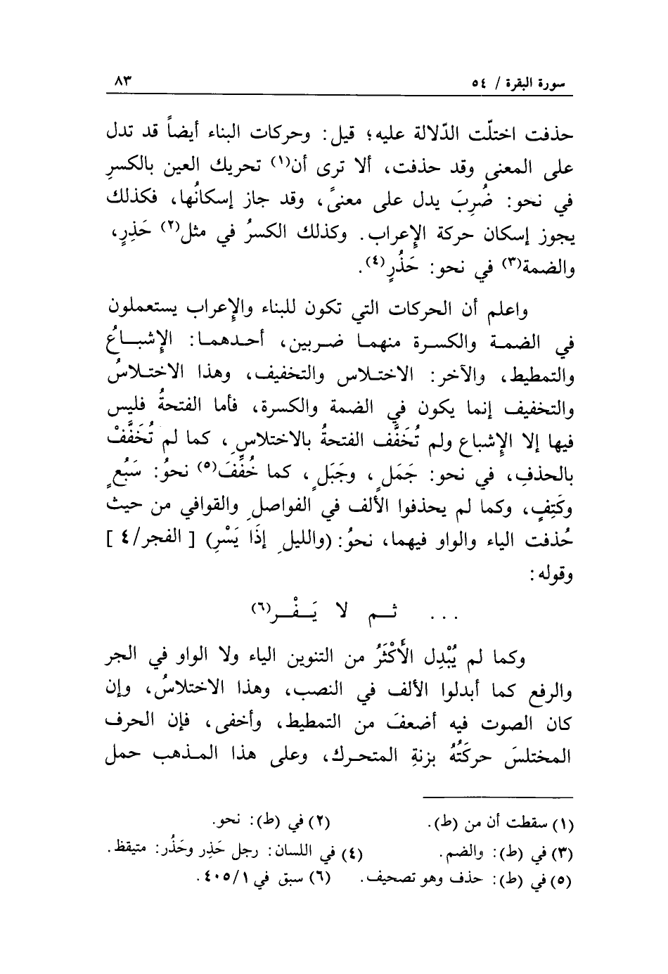 ... ثم لا يفر «6» وكما لم يبدل الأكثر من التنوين الياء ولا الواو في الجر والرفع كما أبدلوا الألف في النصب، وهذا الاختلاس، وإن كان الصوت فيه أضعف من التمطيط، وأخفى، فإن الحرف المختلس حركته بزنة المتحرك، وعلى هذا المذهب حمل