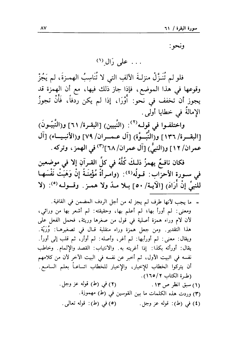 واختلفوا في قوله «2»: النَّبِيِّينَ [البقرة/ 61] والنَّبِيُّونَ [البقرة/ 136] والنُّبُوَّةَ [آل عمران/ 79] والْأَنْبِياءَ [آل عمران/ 112] والنَّبِيُّ [آل عمران/ 68] «3» في الهمز، وتركه.