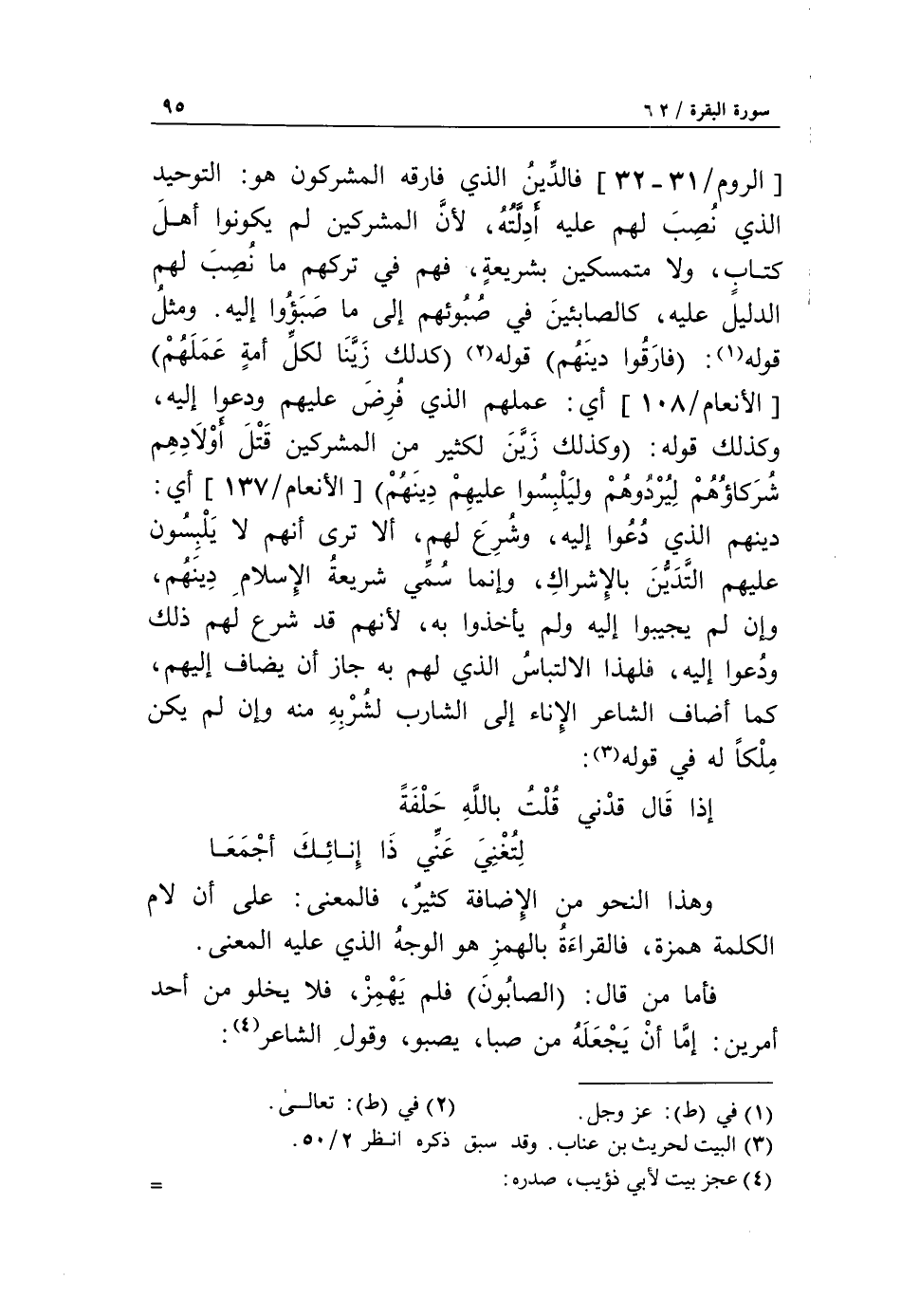 [الروم/ 31 - 32] فالدّين الذي فارقه المشركون هو: التوحيد الذي نصب لهم عليه أدلّته، لأنّ المشركين لم يكونوا أهل كتاب، ولا متمسكين بشريعة، فهم في تركهم ما نصب لهم الدليل عليه، كالصابئين في صبوئهم إلى ما صبئوا إليه. ومثل قوله «1»: فارقوا دينهم قوله «2» كَذلِكَ زَيَّنَّا لِكُلِّ أُمَّةٍ عَمَلَهُمْ [الأنعام/ 108] أي: عملهم الذي فرض عليهم ودعوا إليه، وكذلك قوله: وَكَذلِكَ زَيَّنَ لِكَثِيرٍ مِنَ الْمُشْرِكِينَ قَتْلَ أَوْلادِهِمْ شُرَكاؤُهُمْ لِيُرْدُوهُمْ وَلِيَلْبِسُوا عَلَيْهِمْ دِينَهُمْ [الأنعام/ 137] أي: