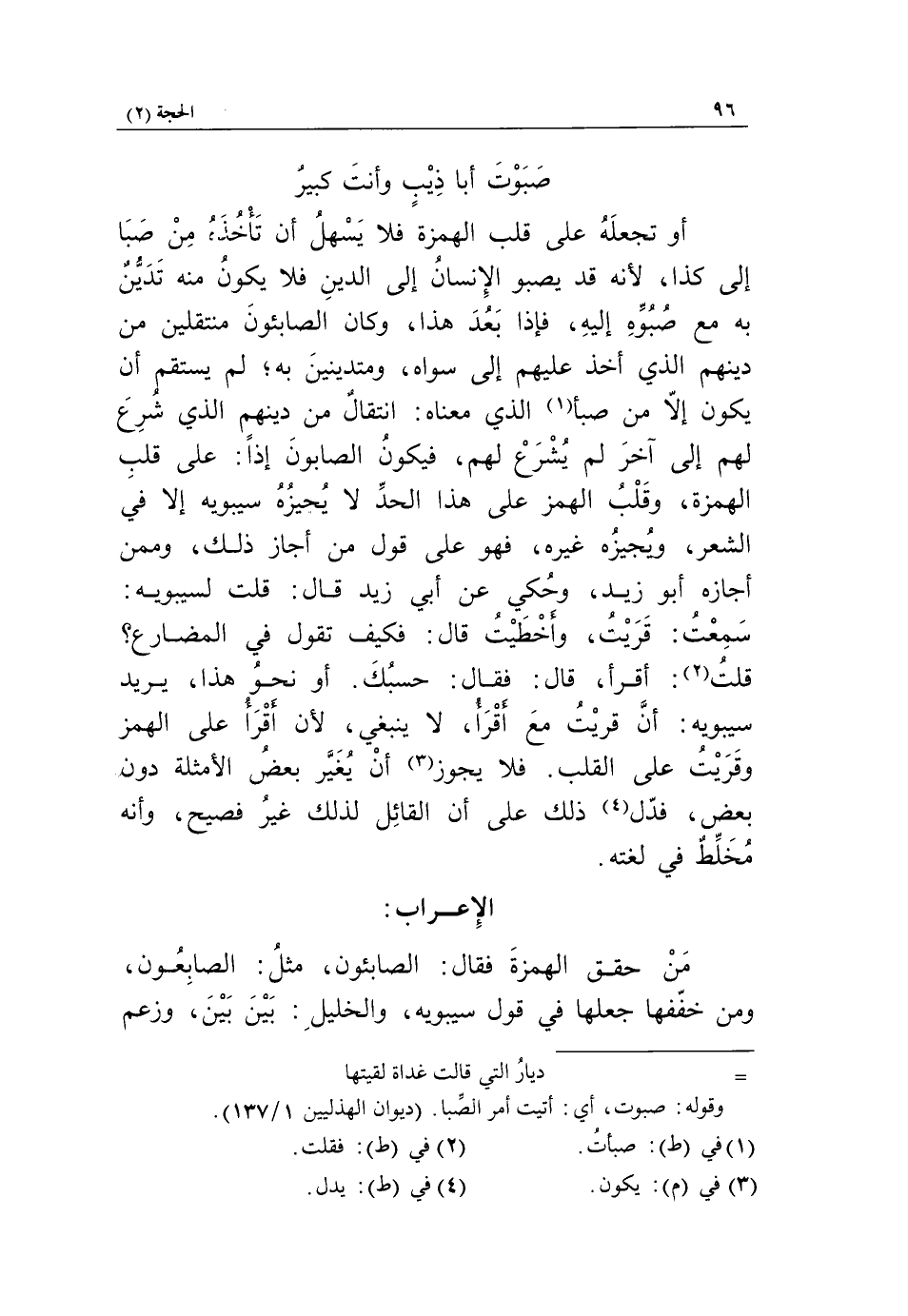 صبوت أبا ذيب وأنت كبير أو تجعله على قلب الهمزة فلا يسهل أن تأخذ، من صبا إلى كذا، لأنه قد يصبو الإنسان إلى الدين فلا يكون منه تديّن به مع صبوّه إليه، فإذا بعد هذا، وكان الصابئون منتقلين من دينهم الذي أخذ عليهم إلى سواه، ومتدينين به، لم يستقم أن يكون إلّا من صبأ «1» الذي معناه: انتقال من دينهم الذي شرع لهم إلى آخر لم يشرع لهم، فيكون الصابون إذا: على قلب الهمزة، وقلب الهمز على هذا الحدّ لا يجيزه سيبويه إلا في الشعر، ويجيزه غيره، فهو على قول من أجاز ذلك، وممن أجازه أبو زيد، وحكي عن أبي زيد قال: قلت لسيبويه:
