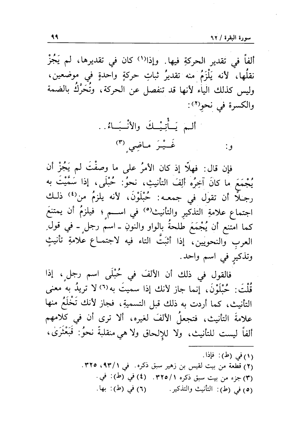 يلزم من «4» ذلك اجتماع علامة التذكير والتأنيث «5» في اسم، فيلزم أن يمتنع كما امتنع أن يجمع طلحة بالواو والنون- اسم رجل- في قول العرب والنحويين، إذا أثبتّ التاء فيه لاجتماع علامة تأنيث وتذكير في اسم واحد.