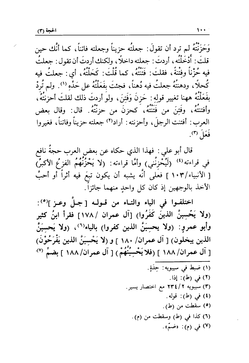 ولا يحسبن الذين كفروا [آل عمران/ 178] فقرأ ابن كثير وأبو عمرو: ولا يحسبن الذين كفروا بالياء «6»، ولا يحسبن الذين يبخلون [آل عمران/ 180] ولا يحسبن الذين يفرحون [آل عمران/ 188] فلا يحسبنهم [آل عمران/ 188] بضمّ «7»